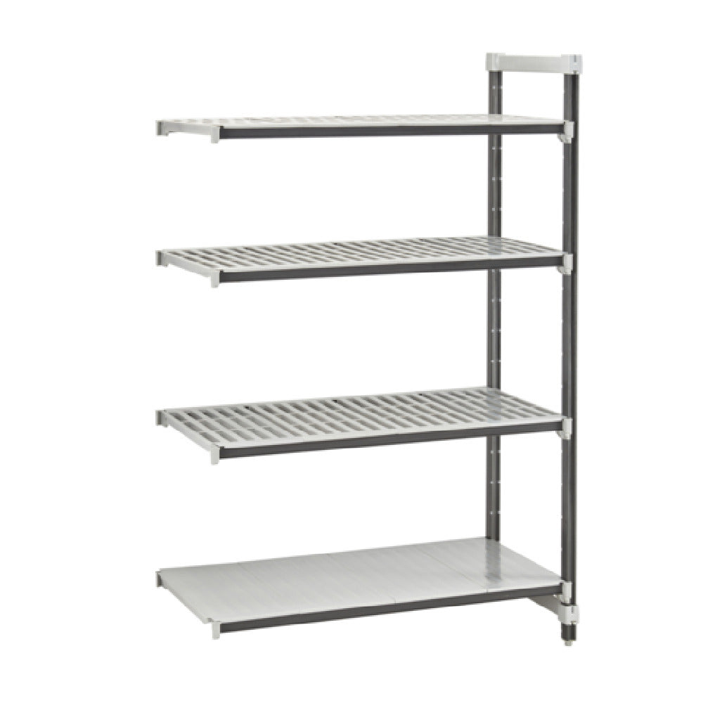The Cambro EXA182464VS4480 Camshelving® Elements XTRA Stationary Add-On Unit is a versatile storage solution designed for a wide range of industries, including food service, catering, and retail. Measuring 18 inches wide, 24 inches long, and 64 inches high, this 4-tier shelving unit is engineered to withstand extreme temperatures ranging from -36°F (-38°C) to 190°F (88°C), making it suitable for various environments. The unit includes three vented and one solid reinforced polypropylene shelf plates, all featuring Camguard® antimicrobial protection, ensuring safe and hygienic storage for sensitive goods. Each shelf supports up to 800 lbs, with a maximum capacity of 2,400 lbs, providing ample strength for heavy-duty use. The unit is equipped with two composite posts with leveling feet for stability, pre-assembled post connectors and wedges, eight Universal Traverses, and four bags of dovetail connectors, totaling eight left and eight right pieces. Finished in a speckled gray color, the unit is NSF certified, ensuring compliance with safety and sanitation standards. It is important to note that this new product line is not compatible with the original Elements Series products, highlighting its unique design and structural enhancements.