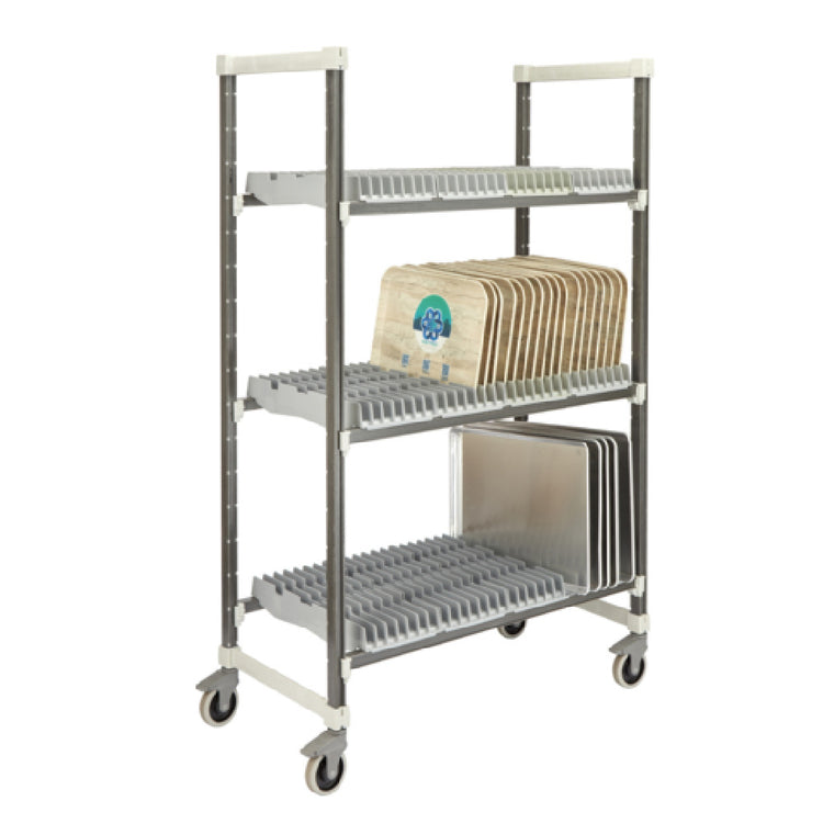 The Cambro EXMU244878DRPKG Camshelving Elements XTRA Series Mobile Drying Rack Cart is an expertly designed solution for efficient drying and storage needs, tailored for various industries such as food service, healthcare, and hospitality. Measuring 24"W x 48"L x 78"H, this mobile drying rack cart boasts an impressive capacity to hold up to 84 trays. It includes drying cradles spread across 3 levels, ensuring optimal airflow and drying efficiency. The cart is equipped with 6 traverses and 3 bags of traverse dovetails, providing sturdy support and easy assembly. Mobility is enhanced with 2 factory-assembled mobile post kits and 4 premium swivel casters, complete with total locking brakes to ensure stability during use. This durable drying rack cart supports a maximum weight bearing of 900 lbs., making it a robust choice for high-volume operations. Constructed in a speckled gray finish, it adds a professional appearance while being NSF listed, which guarantees adherence to public health and safety standards. Designed with convenience in mind, the Cambro EXMU244878DRPKG ships in 5 boxes, simplifying transportation and setup for users. This product is a reliable and versatile tool for organizations that require efficient drying and storage solutions.