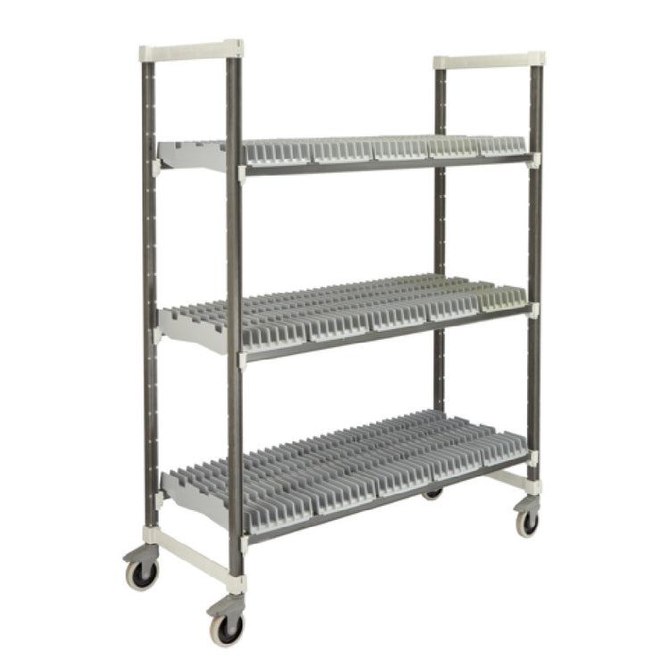The Cambro EXMU246078DRPKG Camshelving Elements XTRA Series Mobile Drying Rack Cart is a versatile and robust solution designed to meet the dynamic demands of the foodservice and hospitality industry. Measuring 24 inches in width, 60 inches in length, and 78 inches in height, this drying rack cart supports up to 105 trays, making it an ideal choice for large-scale operations. The unit includes drying cradles for three levels, providing organized and efficient drying space. It is equipped with six traverses and three bags of traverse dovetails, enhancing its stability and functionality. The cart features two factory-assembled mobile post kits and is fitted with four premium swivel casters that have a total locking brake system, ensuring smooth mobility and secure positioning as needed. With a maximum weight-bearing capacity of 900 pounds and constructed in a speckled gray finish, this NSF-listed cart ensures durability and compliance with safety standards. It is shipped in six boxes, facilitating transportation and assembly. The Cambro EXMU246078DRPKG is a practical and reliable drying solution for any professional kitchen or foodservice environment, combining capacity, mobility, and durability in its design.