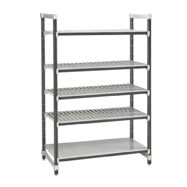The Cambro EXU215484VS5480 Camshelving® Elements XTRA Stationary Starter Unit is a versatile storage solution, measuring 21 inches in width, 54 inches in length, and 84 inches in height. This 5-tier shelving unit is engineered to withstand extreme temperatures ranging from -36°F (-38°C) to 190°F (88°C), making it suitable for various environments, including cold storage and heated areas. The unit features four vented and one solid reinforced polypropylene shelf plates, all equipped with Camguard® antimicrobial protection to maintain hygiene. It includes four composite posts with leveling feet for stability, pre-assembled post connectors and wedges for easy assembly, and 10 Universal Traverses along with five bags of dovetails to ensure secure shelf placement. Each shelf can support up to 800 lbs, with a maximum capacity of 2,400 lbs for the entire unit. Finished in a speckled gray color, this shelving is NSF certified, emphasizing its compliance with health and safety standards. It is important to note that this is a new product line and is not compatible with the original Elements Series products. The Cambro EXU215484VS5480 is ideal for businesses seeking durable and adaptable shelving in various industrial and commercial settings.