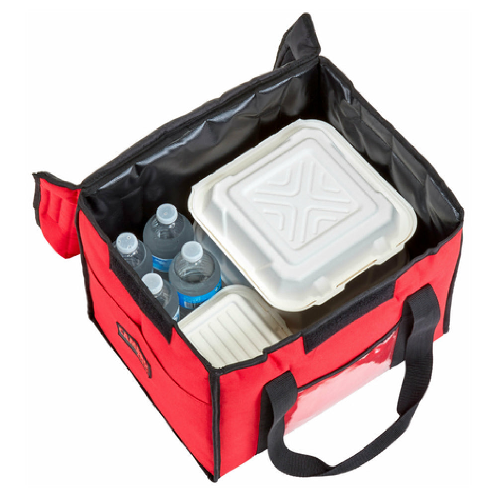 The Cambro GBD151212521 GoBag® Sandwich Delivery Bag is a robust solution tailored for efficient food delivery services, measuring 15" x 12" x 12". This versatile bag is designed with a Velcro lid for secure closure, ensuring the safety and freshness of its contents during transportation. A sewn-in ticket pouch offers convenient order management, complemented by a clear front ticket window for easy visibility of delivery information. The bag features sewn-in straps, enhancing handling and maneuverability for delivery personnel. Its side pocket offers additional space for carrying essential items. Constructed from durable nylon fabric, this delivery bag is machine washable, promoting ease of maintenance and hygiene. It incorporates high-density insulation, essential for maintaining optimal temperature control, thereby ensuring food quality upon delivery. The vibrant Cambro red color is not only aesthetically pleasing but also easily recognizable, facilitating brand visibility. This delivery bag is an ideal choice for businesses in the food service industry, including restaurants, cafes, and catering services, seeking reliable and efficient delivery solutions. Its thoughtful design and practical features underscore its value across various market segments within the food delivery industry.