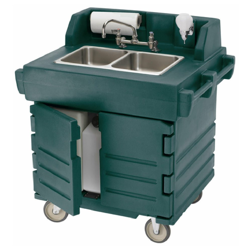 The Cambro KSC402192 CamKiosk® Hand Sink Cart with 2 Compartment Sink is a versatile solution designed for environments requiring portable sanitation. This unit boasts a durable polyethylene construction, ensuring longevity and resistance to wear. Featuring two 5-gallon fresh water tanks alongside two 7-1/2 gallon refuse tanks, it provides ample water capacity for continuous use. Additionally, the cart is equipped with a 2-1/2 gallon hot water heater, ensuring warm water availability for enhanced sanitation. This hand sink cart includes practical features such as a paper towel holder and a soap dispenser, supporting hygiene practices. It is fitted with 6" casters, comprising two fixed and two swivel casters with brakes, enabling both mobility and stability. Operating at 110 volts, this unit is suitable for a wide range of settings. The product is presented in a stylish granite green finish, making it an attractive addition to any professional environment. This comprehensive setup is ideal for food service operations, catering events, or any setting where hand washing facilities are needed but plumbing is not readily accessible, providing a complete and mobile hygiene solution.