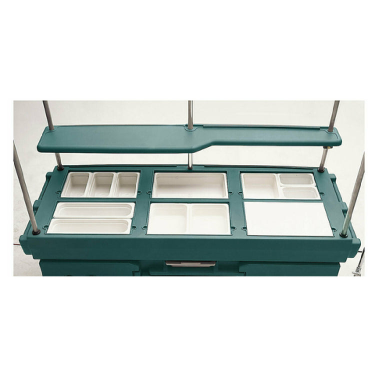 The Cambro KVC856192 CamKiosk® Cart is a highly versatile and mobile food service solution, engineered to meet the demands of various market segments including catering, events, and institutional dining. Measuring 85-1/8" x 33-1/2" x 70-1/2", this cart is built from durable polyethylene, ensuring longevity and resistance to wear and tear. It features six pan wells, providing ample space for food storage and serving, making it ideal for high-capacity environments. The cart is insulated with foam, which aids in maintaining the temperature of hot or cold items during service. Mobility is enhanced by four 6" swivel casters, two of which include brakes for secure positioning during operation. The granite green finish adds a touch of elegance to its robust functionality, making it as attractive as it is practical. This combination of features makes the Cambro KVC856192 CamKiosk® Cart a valuable investment for professionals seeking reliability and efficiency in their food service operations.