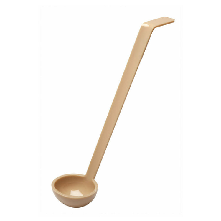 The Cambro LD105133 Camwear® Ladle 10-9/16" 1 Oz. is a meticulously designed kitchen tool, perfect for both professional chefs and home cooking enthusiasts. Measuring 10-9/16 inches in length, this ladle offers an ideal reach for serving soups, stews, and sauces in a variety of culinary settings. It features a 1-ounce capacity, which ensures precise portioning and control during meal preparation. Made from durable polycarbonate, the ladle is plain and presented in a subtle beige color, making it a versatile addition to any kitchen aesthetic. This material choice not only guarantees long-term use without degradation but also provides a lightweight feel for ease of handling, reducing strain during extended use. Additionally, the Cambro LD105133 is NSF certified, indicating its compliance with high standards of health and safety, a crucial factor for commercial kitchens and food service operations. Its design, durability, and certification make it a valuable asset in diverse market segments, from hospitality and catering to everyday home use, where reliability and precise serving are essential.
