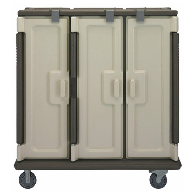 The Cambro MDC1411T60194 Meal Delivery Cart (modified for use in correctional facilities) is a robust and versatile solution designed to meet the demanding needs of institutional food service operations. This cart features a tall profile with three compartments, capable of holding up to 60 trays, each either 1411CW or 1411CP, along with 853 insert trays, making it ideal for high-capacity meal delivery. The cart measures 60 inches in width, 29-1/4 inches in depth, and 63-5/8 inches in height, providing ample space for meal transportation. Constructed with heavy-duty aluminum handles secured with security screws, it ensures durability and ease of maneuverability. The cart is equipped with three doors for efficient access and includes lock blocks on door hinge pins for enhanced security, which is crucial in correctional facilities. Featuring 6-inch heavy-duty casters, the cart offers smooth mobility across various surfaces. The granite sand finish with cream-colored doors adds a touch of aesthetics while maintaining a professional appearance. NSF certification underscores its compliance with public health standards, making it a reliable and secure choice for correctional facility food service needs.