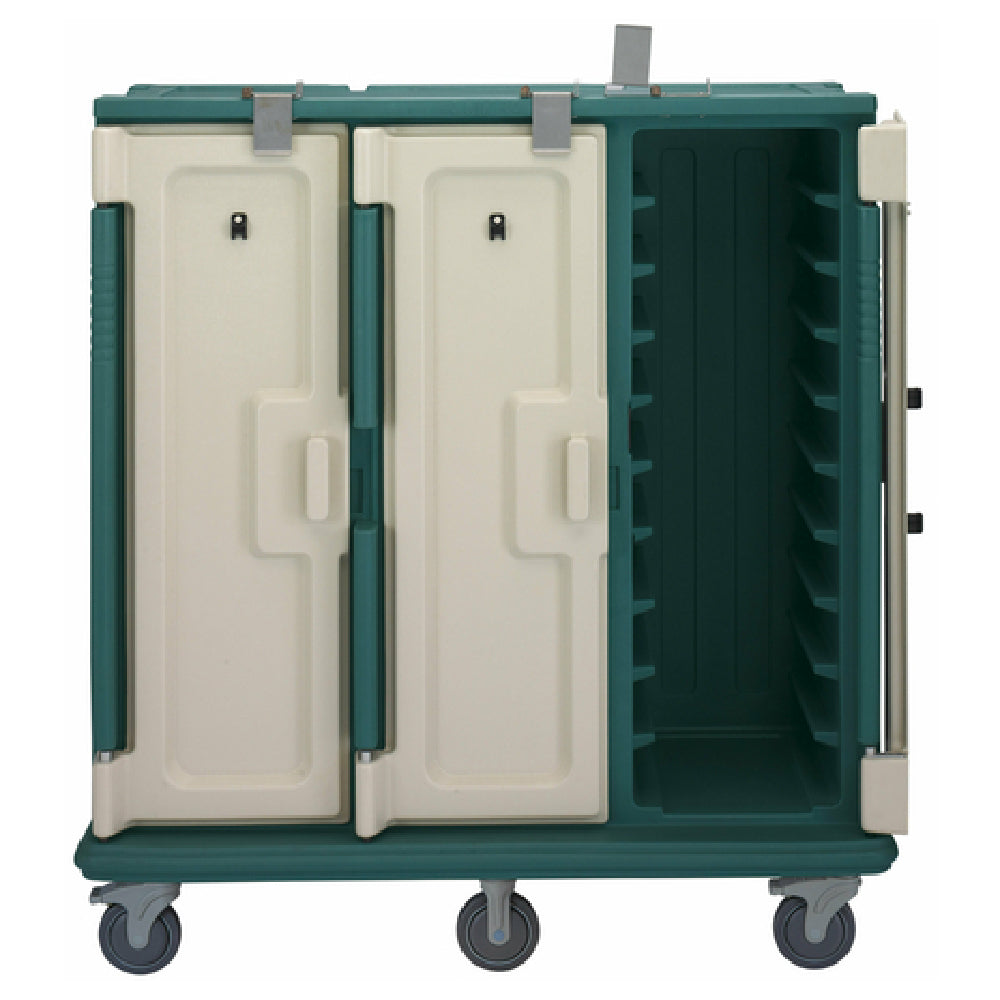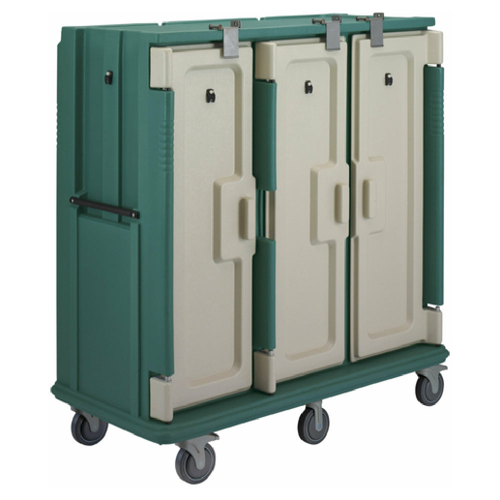 The Cambro MDC1418T30192 Meal Delivery Cart Tall Profile (3) Doors is a versatile solution designed to meet the demanding needs of meal delivery services in various industries. This cart stands out with its substantial dimensions of 60"W x 29-1/4"D x 63-5/8"H, providing ample space with three compartments capable of holding up to thirty 14" x 18" trays. Its tall profile is optimized for efficient space utilization and ease of access, making it suitable for high-volume environments. The cart is equipped with heavy-duty nylon handles, strategically placed one per end, ensuring ease of maneuverability. Its mobility is further enhanced by 6" stainless steel casters, featuring two rigid casters and two swivel casters with a brake and offset design for stability and control. The cart's exterior is finished in a granite green with cream-colored doors, which not only enhances its aesthetic appeal but also complements various operational settings. Additionally, this meal delivery cart is NSF certified, symbolizing its adherence to strict health and safety standards. The Cambro MDC1418T30192 is engineered for reliability and efficiency, making it an essential asset for healthcare facilities, hotels, and catering services seeking to streamline their meal delivery processes with a durable and functional solution.