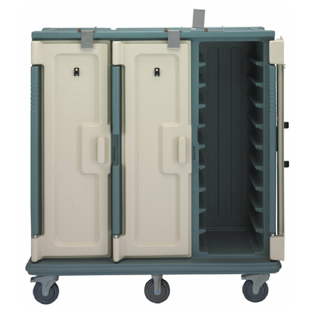 The Cambro MDC1418T30401 Meal Delivery Cart Tall Profile (3) Doors is a meticulously designed meal delivery solution, tailored to accommodate the dynamic needs of healthcare, hospitality, and institutional food service sectors. This cart features a tall profile with three distinct compartments, each accessed through its durable door, providing ample space and organization for meal transport. It efficiently holds up to thirty 14-inch by 18-inch trays, ensuring robust capacity for large-scale meal delivery. The cart measures 60 inches in width, 29-1/4 inches in depth, and 63-5/8 inches in height, striking a balance between accommodating storage and maneuverability. Equipped with heavy-duty nylon handles, one positioned at each end, the meal delivery cart emphasizes ease of handling and user comfort. Its mobility is assured by 6-inch stainless steel casters, comprising two rigid and two swivel with brake, arranged in an offset configuration for enhanced stability and control. The cart's aesthetic design, highlighted by a slate blue body with cream-colored doors, complements its functional appeal. Certified by NSF, this cart meets stringent public health and safety standards, making it a reliable choice for delivering meals efficiently and safely across different service environments.