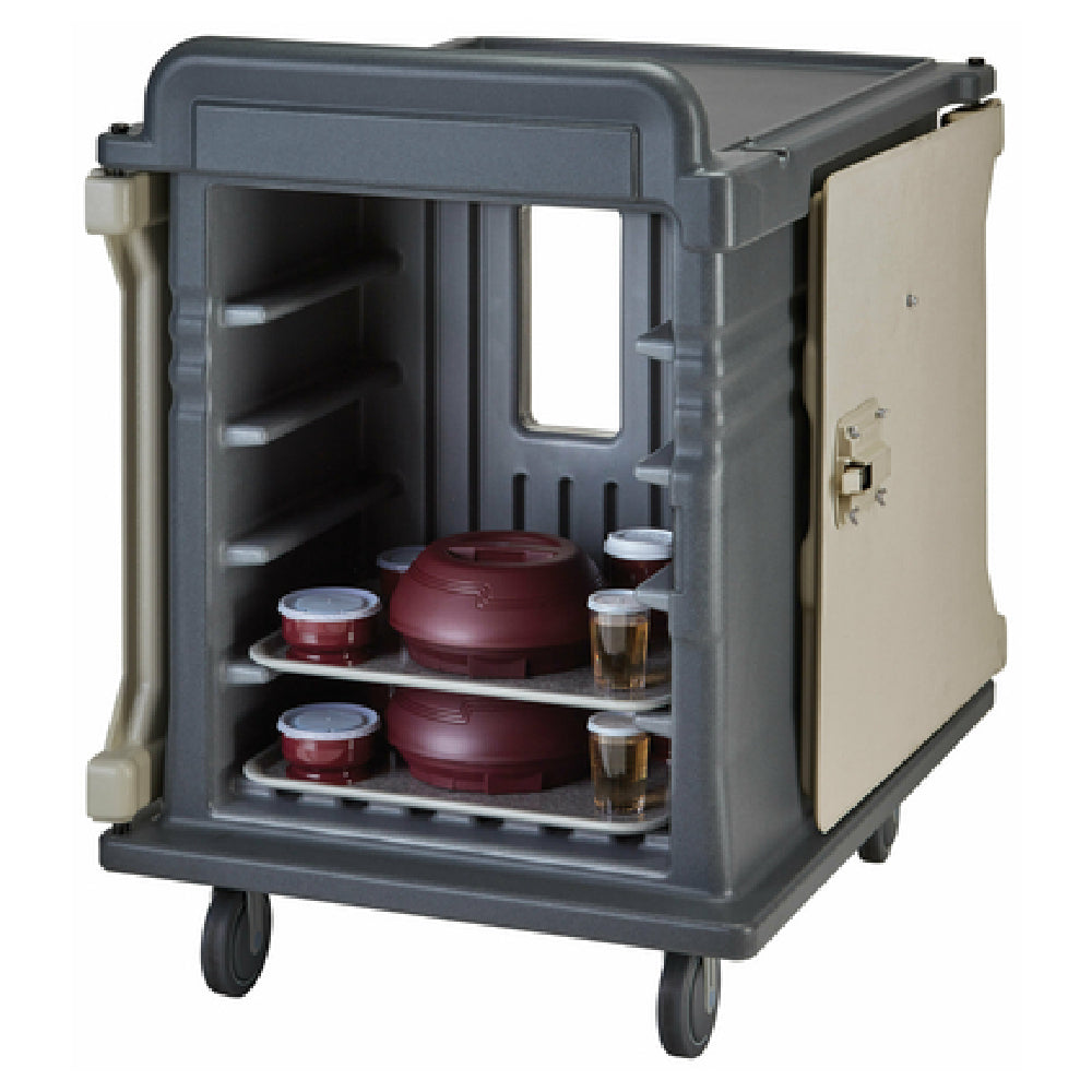 The Cambro MDC1520S10D191 Meal Delivery Cart is an expertly designed utility cart, measuring 30-3/8"W x 38-1/4"D x 42-3/4"H, that prioritizes both functionality and efficiency in meal delivery solutions. Featuring two doors and one compartment, this cart is equipped with dual access, enhancing the ease of use in fast-paced environments. The insulated design ensures temperature retention, making it ideal for institutions like hospitals and hotels where maintaining meal temperature is crucial. This cart can accommodate ten 15" x 20" trays, providing ample capacity for large-scale meal service. With a menu clip and self-venting system, it maximizes operational efficiency while maintaining food quality. The molded-in marine rail offers added stability during transportation. Outfitted with four 5" quiet standard non-marking nylon casters, which include two rigid and two swivel with brake, it ensures smooth maneuverability without leaving marks on flooring surfaces. The cart's granite gray body with cream color doors adds a touch of sophistication, making it aesthetically pleasing in any setting. This combination of features makes the Cambro MDC1520S10D191 an invaluable asset for food service operations requiring reliable, durable, and efficient meal delivery solutions.