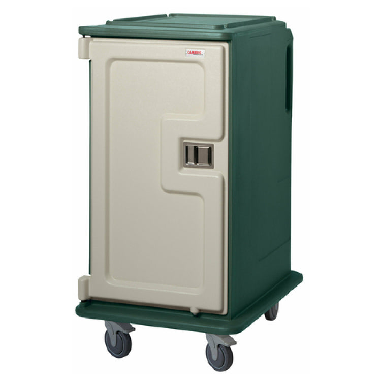 The Cambro MDC1520T16192 Meal Delivery Cart Tall Profile (1) Door is a specialized meal delivery solution designed to enhance efficiency and organization in food service operations. Featuring a tall profile, this cart accommodates two compartments capable of holding up to sixteen 15-inch by 20-inch trays, optimizing space and capacity for meal transport. The cart measures 30-5/8 inches in width, 39-1/8 inches in depth, and stands at a height of 58-1/8 inches, providing significant storage while maintaining a compact footprint suitable for various environments. Constructed with molded-in handles, one at each end, it ensures easy maneuverability. The cart is equipped with 6-inch stainless steel casters, including two rigid and two swivel with brakes, enhancing stability and control during transit. The granite green finish, complemented by a cream-colored door, adds a touch of elegance and durability. This product is NSF certified, assuring compliance with rigorous public health and safety standards. The Cambro MDC1520T16192 Meal Delivery Cart is ideal for hospitals, catering services, and institutional settings, where efficient and reliable meal delivery systems are crucial. Its thoughtful design and robust construction make it a valuable asset for operations prioritizing hygiene, mobility, and durability.