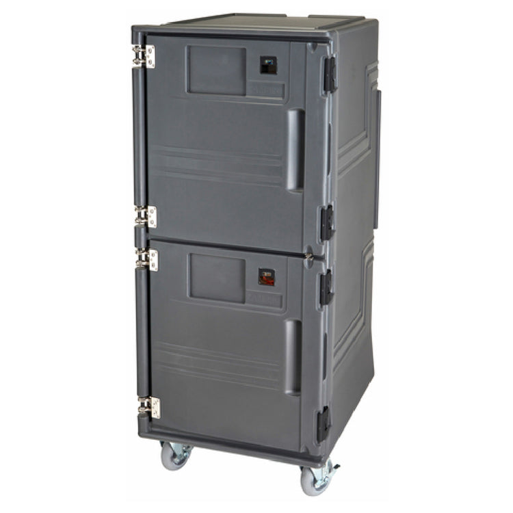 The Cambro PCUHCSP615 Security Package Pro Cart Ultra™ Hot/Cold Food Pan Carrier is an advanced solution designed for efficient food transportation and storage in professional kitchens. This versatile carrier is electrically powered, featuring a top heated and bottom cold compartment, making it ideal for maintaining the desired temperatures of various foods during service. It can accommodate up to sixteen 18" x 26" sheet pans, thirty-two 13" x 18" half-size sheet pans, thirty-two GN 1/1 food pans with a 2-1/2" depth, as well as sixteen trays measuring 15-3/4" x 23-1/2" and sixteen pizza boxes sized 16" x 16" x 2". The unit is equipped with two gasket-free magnetic quick-close doors, which are non-removable and reinforced with 4-inch nylon latches for secure operation. Constructed from durable polyethylene in a charcoal gray finish, it features molded-in handles and a perimeter bumper for easy mobility and protection. The carrier also includes five pairs of stainless steel universal rails with 3-inch to 1-1/2-inch spacing for versatile configuration, along with a solar digital thermometer for temperature monitoring. With a 9-foot cord and tamper-resistant casters, including two swivel casters with brakes, this unit ensures stability and convenience in demanding environments.