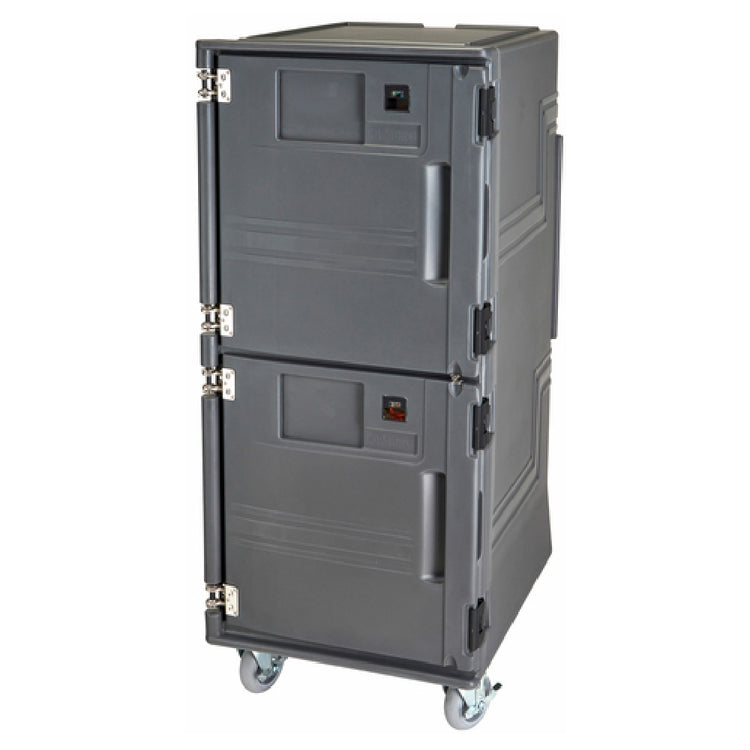 The Cambro PCUPPSP615 Security Package Pro Cart Ultra™ Ambient Food Pan Carrier is a non-electric, front-loading unit designed to maintain hot or cold temperatures for up to 4 hours, making it an essential tool for food service operations requiring reliable temperature retention. This versatile carrier accommodates up to 16 full-size 18" x 26" sheet pans, 32 half-size 13" x 18" sheet pans, 32 GN 1/1 food pans with a depth of 2-1/2", 16 trays measuring 15-3/4" x 23-1/2", and 16 pizza boxes sized 16" x 16" x 2". It features two gasket-free magnetic quick-close doors, offering ease of access and security without the need for removable components. The carrier's robust design includes 4" nylon latches and molded-in handles for enhanced durability and maneuverability. With 5 pairs of stainless steel Universal rails, it allows for adjustable compartment spacing of 3" and 1-1/2". Its polyethylene exterior is complemented by a perimeter bumper for added protection. Equipped with a solar digital thermometer for temperature monitoring, it is mounted on heavy-duty 6" x 2" tamper-resistant casters, featuring two fixed and two swivel with brakes. Finished in a sophisticated charcoal gray, this unit is cETLus certified, ensuring compliance with safety standards.