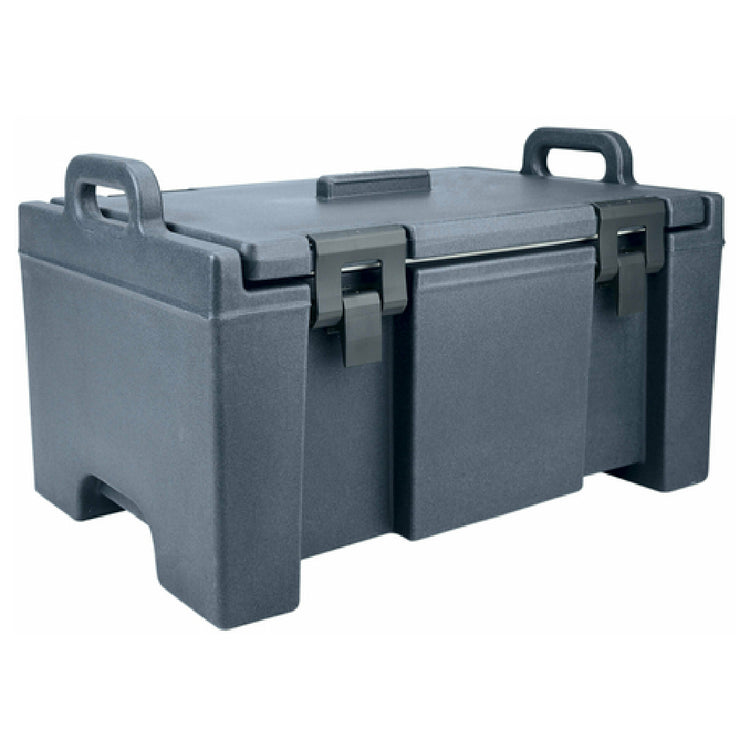 The Cambro UPC100191 Ultra Pan Carriers® is a top-loading solution designed to accommodate one GN full size or fractional pans up to 8 inches deep, making it suitable for various catering and food service environments. With an approximate capacity of 40 quarts, this unit offers excellent thermal retention, maintaining hot temperatures between 190°F and 179°F and cold temperatures between 33.9°F and 35.8°F for up to four hours. The carrier features four E-Z grip molded-in handles for ease of transport and four durable nylon over-center latches for secure closure. A removable gasket and self-venting design enhance its usability, while the dishwasher-safe construction ensures convenience in cleaning. Its scratch-resistant textured exterior and one-piece seamless double-wall design, constructed from durable polyethylene and insulated with polyurethane foam, ensure longevity and reliability. The Cambro UPC100191 is NSF certified, making it a trusted choice for maintaining food safety standards. Available in a sleek granite gray finish, this carrier is an essential asset for catering services, food transport operations, and any industry requiring reliable temperature maintenance for their culinary products.