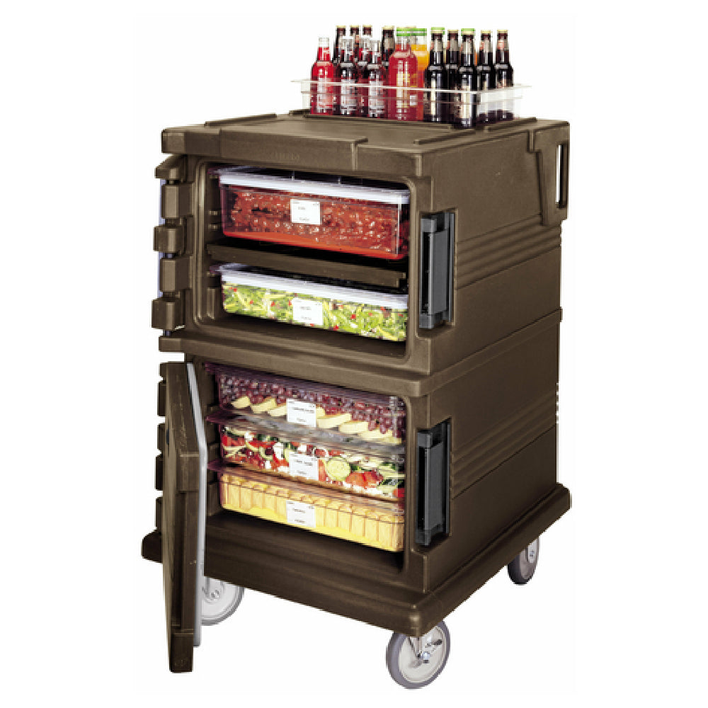 The Cambro UPC1200131 Ultra Camcart® Food Pan Carrier is an expertly designed piece of equipment, featuring a front-loading, one-piece double wall polyethylene shell that guarantees durability and consistent performance. This food pan carrier is built to accommodate various storage needs; it holds up to sixteen 2-1/2" deep full-size pans, twelve 4" deep full-size pans, eight 6" deep full-size pans, or four 8" deep full-size pans, with an approximate capacity of 90 quarts. Its foam insulation ensures optimal temperature retention, making it ideal for catering businesses and food service operations that require reliable thermal management. The molded-in handles and bumpers enhance portability and protection, while the nylon latch and air-tight gasket ensure secure closure and freshness. Equipped with a vent cap and four 6" casters (two fixed, two swivel, one with a brake), this unit offers ease of movement and stability. Finished in a dark brown color, the Cambro UPC1200131 is NSF-certified, reflecting its compliance with high standards of food safety and sanitation. This food pan carrier is a suitable choice for professionals seeking dependable and versatile food transport solutions within the catering and hospitality industry.