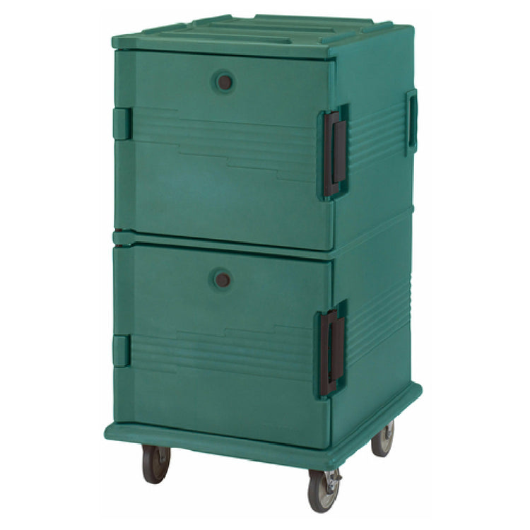 The Cambro UPC1600SP519 Ultra Camcart® Food Pan Carrier is a robust front-loading unit designed for the efficient transport and storage of food pans. It features a resilient one-piece double wall polyethylene shell with foam insulation, ensuring optimal temperature retention. This carrier has a remarkable capacity, accommodating 24 full-size pans that are 2-1/2" deep, 16 pans at 4" deep, 12 pans at 6" deep, and 8 pans at 8" deep, with an approximate capacity of 120 quarts. It is designed with a security package and tamper-resistant features, including molded-in handles and bumpers, a nylon latch, and an air-tight gasket with a vent cap, ensuring the safety and integrity of its contents during transit. Mobility is made easy with four heavy-duty 6" casters, two of which are fixed and two are swivel with brakes, providing stability and maneuverability. The carrier is presented in an attractive green color and adheres to NSF standards, signifying its compliance with public health and safety standards. This Ultra Camcart is an essential asset for catering services, banquet facilities, and any commercial kitchen that requires reliable and secure food transportation solutions.