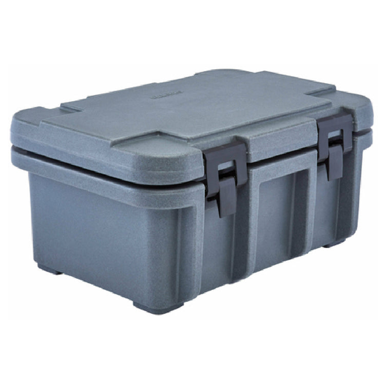The Cambro UPC180191 Ultra Pan Carrier® is a top-loading, highly versatile transport unit designed to hold one GN full-size or fractional pan up to 8 inches deep, with an approximate capacity of 24-1/2 quarts. This carrier excels in maintaining temperature retention for up to four hours, with hot retention between 190°F and 179°F and cold retention from 33.9°F to 35.8°F. It is engineered with four E-Z grip molded-in handles and four nylon over-center latches, ensuring secure handling and ease of transport. The removable gasket and self-venting design contribute to its effective temperature management and ease of maintenance. Constructed from durable polyethylene with a scratch-resistant textured exterior, this unit boasts one-piece seamless, double-wall polyurethane foam insulation. Stackable with the Camcarrier®, this granite gray carrier is also dishwasher safe and NSF certified, making it ideal for catering services, foodservice operations, and institutional use, where reliability and food safety are paramount. Its robust construction ensures longevity while its functional design enhances efficiency in any professional kitchen environment.