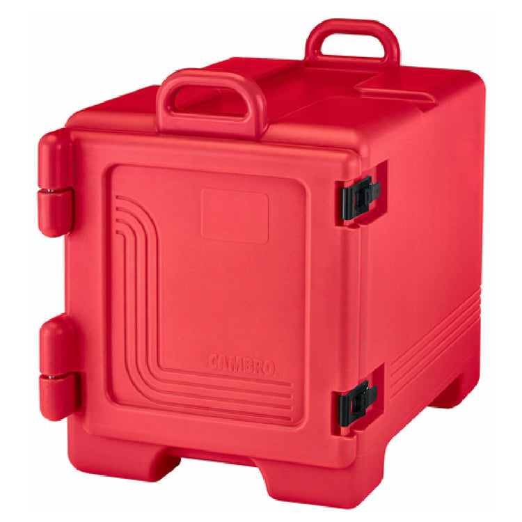 The Cambro UPC300158 Ultra Pan Carrier® is a front-loading, high-performance food storage solution, distinguished by its one-piece poly shell and robust polyurethane insulation. It is engineered to accommodate 1/2, 1/3, and full-size pans ranging from 2-1/2" to 8" in depth, with an approximate capacity of 36 qt. This carrier is specifically designed to maintain food at safe temperatures for over four hours, making it an invaluable asset in catering and food service industries. The innovative design includes a fully removable, gasketless door that opens to an impressive 270°, providing effortless access and cleaning. Equipped with two sturdy handles, it ensures safe and convenient transport. A labeling area on the door facilitates easy identification of contents. The carrier is stackable, enhancing space efficiency in busy kitchens. Its striking hot red color complements its design credentials and it is also dishwasher safe for ease of maintenance. NSF certification underscores its compliance with health and safety standards. The Cambro UPC300158 integrates superior functionality with practical design, offering exceptional value for professionals in the culinary and hospitality sectors.