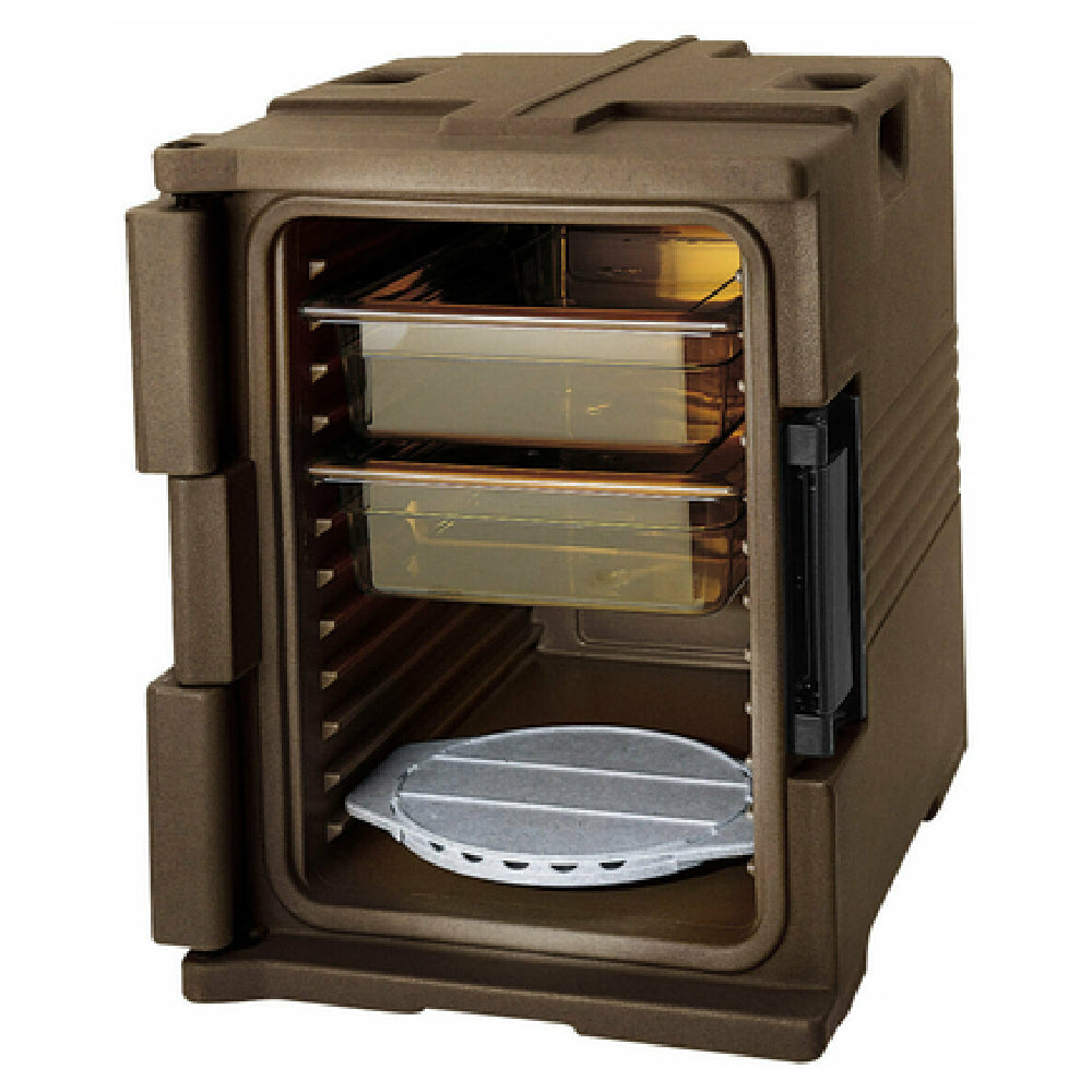 The Cambro UPC400131 Ultra Pan Carrier® is a versatile front-loading unit designed for the efficient transportation and storage of food pans. Featuring a one-piece poly shell, this carrier provides robust protection and insulation, making it an essential tool for catering services and commercial kitchens. The unit can accommodate a range of pan sizes, including 1/2, 1/3, and full-size pans with depths ranging from 2-1/2 inches to 8 inches, and has an approximate capacity of 60 quarts. Its foam insulation ensures optimal temperature retention for hot or cold food items during transport. The molded-in handles enhance portability, while the nylon latch offers secure closure. An air-tight gasket and vent cap maintain internal conditions, preventing spills and leaks. The Cambro UPC400131 is stackable, optimizing storage space, and is dishwasher safe for easy cleaning. With its dark brown finish and NSF certification, this carrier meets food safety standards while providing a durable and reliable solution for food service professionals seeking to maintain product integrity from kitchen to event site.