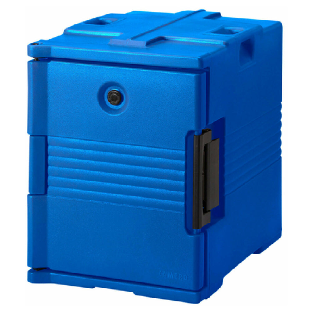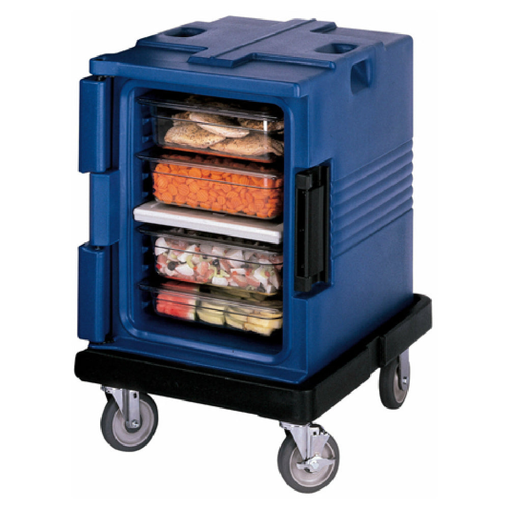 The Cambro UPC400186 Ultra Pan Carrier® Front Loading One-piece Poly Shell is a versatile and durable solution for the food service industry, designed to meet the diverse needs of caterers, restaurants, and other food service operations. With a robust capacity of approximately 60 qt., this carrier is engineered to hold various pan sizes, including 1/2, 1/3, and full-size pans ranging from 2-1/2" to 8" deep. Constructed with a one-piece poly shell and foam insulation, it ensures optimal temperature retention and durability. The carrier features molded-in handles and a nylon latch, providing ease of transport and secure closure. An air-tight gasket and vent cap enhance its performance by maintaining food quality during transit. The Cambro UPC400186 is stackable, maximizing space efficiency in storage and transport. Additionally, it is dishwasher safe, facilitating easy cleaning and maintenance. This model is finished in an appealing navy blue and is NSF certified, guaranteeing compliance with health and safety standards. Its design caters to the high demands of the food service industry, offering a reliable and efficient solution for transporting hot or cold food items while maintaining their quality and safety.