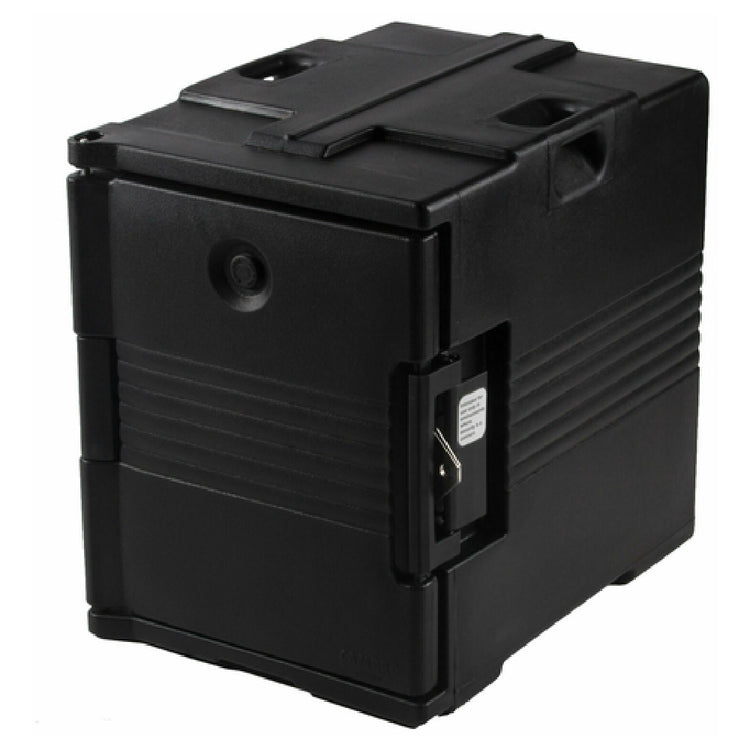 The Cambro UPC400SP110 Ultra Pan Carrier® is a highly versatile front-loading unit designed for efficient food transport and storage. This carrier features a one-piece poly shell construction, ensuring durability and effective insulation, with foam insulation maintaining optimal food temperatures during transit. It accommodates a range of pan sizes - including 1/2, 1/3, and full-size pans - with depths from 2-1/2 inches to 8 inches, and an approximate capacity of 60 quarts. The Cambro UPC400SP110 is equipped with a security package, featuring tamper-resistant components, enhancing safety and reliability for catering operations. Molded-in handles provide ease of transport, while a robust nylon latch ensures secured closure. An air-tight gasket and vent cap work together to maintain the integrity of the internal environment. The carrier is stackable, optimizing space efficiency during storage and transport. Its construction supports ease of cleaning, being dishwasher safe, and it is finished in a sleek black color. Certified by NSF, this pan carrier meets stringent public health standards, making it a trusted choice for professionals in the food service industry seeking a dependable solution for food storage and transportation.
