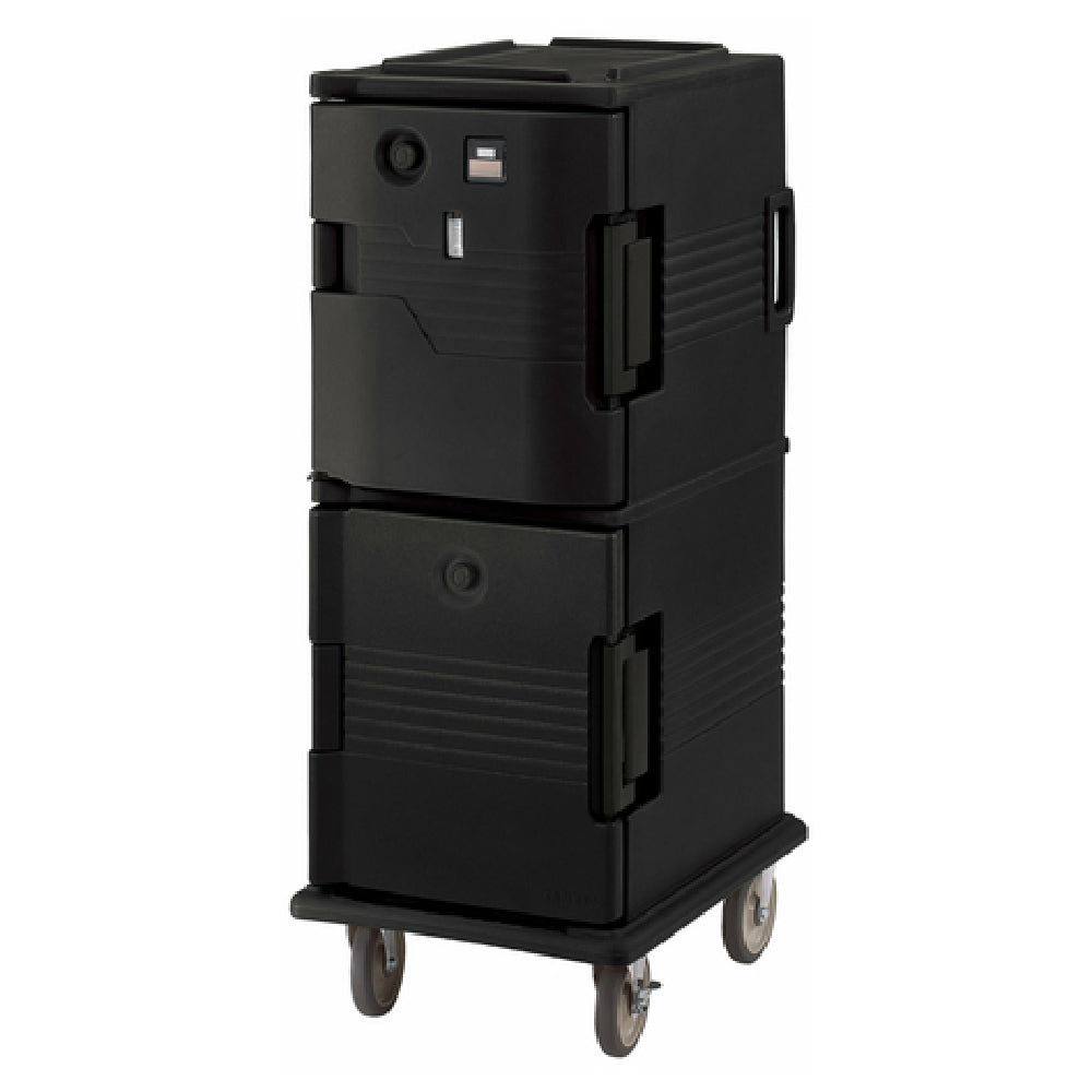 The Cambro UPCHT800110 Ultra Camcart® Heated Food Pan Carrier is a front-loading unit designed to efficiently hold and transport a variety of food pans. With dimensions of 20-1/2"W x 27-1/8"D x 54"H, this carrier is crafted with a one-piece double wall polyethylene shell and insulated with polyurethane foam, ensuring optimal heat retention. It accommodates up to 12 food pans at 2-1/2" deep, 8 pans at 4" deep, 6 pans at 6" deep, and 4 pans at 8" deep, providing flexibility for different serving needs. The heated top door only design is complemented by molded-in handles and a nylon latch for secure and convenient use. Mobility is enhanced by four 6" casters, with two swivel and one featuring a brake. Operating at 110v/50/60/1-ph with a power consumption of 230 watts and 2.0 amps, the unit is equipped with a NEMA 5-15P plug. Available in black, it meets NSF, ENERGY STAR®, cETLus, and CE standards, making it a reliable and energy-efficient choice for catering, food service, or hospitality sectors requiring dependable heated transportation of multiple food items.