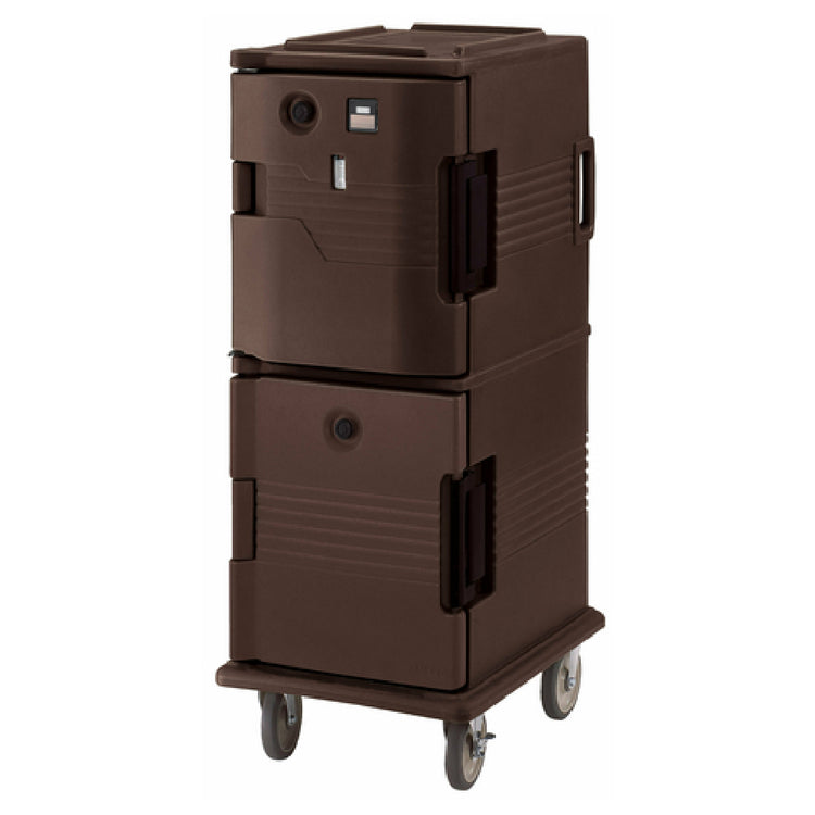 The Cambro UPCHT800131 Ultra Camcart® Heated Food Pan Carrier is a highly efficient solution for food service professionals requiring reliable temperature maintenance during transport. Measuring 20-1/2"W x 27-1/8"D x 54"H, this top-door-only heated carrier is ideal for front-loading operations. Constructed with a one-piece double-wall polyethylene shell and insulated with polyurethane foam, it ensures optimal heat retention. The UPCHT800131 can accommodate various pan depths, holding up to 12 pans at 2-1/2" deep, 8 pans at 4" deep, 6 pans at 6" deep, or 4 pans at 8" deep, offering versatility for different catering needs. Designed for ease of use, the unit features molded-in handles, a durable nylon latch, and a vent cap for steam release. Mobility is facilitated by four 6" casters, including two swivel, two fixed, with one caster equipped with a brake for added stability. Operating at 110v/50/60/1-ph with a power consumption of 230 watts and 2.0 amps, it utilizes a NEMA 5-15P plug. Finished in a sleek dark brown, it meets NSF, ENERGY STAR®, cETLus, and CE standards, making it a dependable choice for maintaining food quality in various food service environments.
