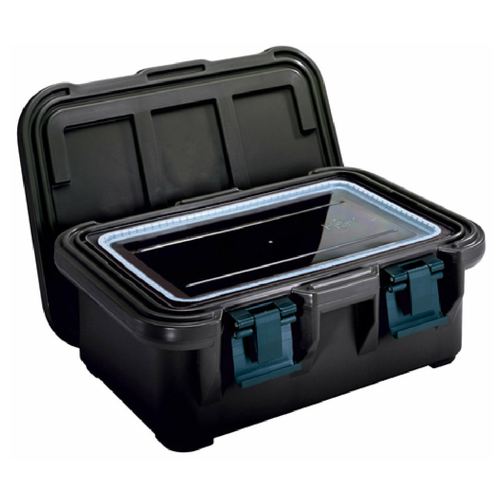 The Cambro UPCS160110 S-Series Ultra Pan Carriers® is an essential solution for catering and food service professionals seeking reliable thermal retention and versatile pan accommodation. As a top-loading carrier, it accommodates (1) GN full size or fractional pans up to 6 inches deep with an approximate capacity of 20 quarts. This unit is engineered with outstanding thermal retention capabilities, maintaining hot contents for up to 4 hours at temperatures between 190°F and 179°F, and cold contents for up to 4 hours within a range of 33.9°F to 35.8°F. Featuring four EZ grip molded-in handles and four nylon latches, this carrier ensures secure handling and transport. Its built-in gasket and self-venting design enhance its functional effectiveness. Constructed from durable polypropylene with polyurethane foam insulation, the carrier is dishwasher safe, ensuring easy maintenance. Its black exterior is stackable with MPC Camcarriers and UPC Ultra Pan Carriers, offering efficient storage solutions. The Cambro UPCS160110 is NSF certified, underscoring its adherence to high public health and safety standards. This carrier is a versatile and dependable choice for diverse market segments in the food service industry, providing efficient and consistent temperature control for both hot and cold items.