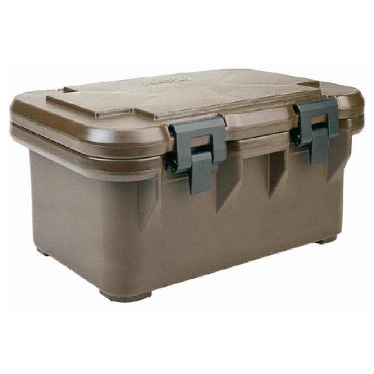 The Cambro UPCS180131 S-Series Ultra Pan Carriers® is a versatile top-loading unit designed to accommodate one GN full-size or fractional pans up to 8 inches deep, with an approximate capacity of 24-1/2 qt. This unit is engineered to maintain contents hot for up to 4 hours within a temperature range of 190° - 179° F, and cold for up to 4 hours at temperatures between 33.9° - 35.8° F. It features four EZ grip molded-in handles and four durable nylon latches, which ensure secure transportation and handling. The built-in gasket and self-venting design enhance efficiency and performance, while its stackable nature allows it to be easily integrated with MPC Camcarriers and UPC Ultra Pan Carriers. Constructed from polypropylene with polyurethane foam insulation, it is both dishwasher safe and NSF certified, ensuring compliance with industry standards. The Cambro UPCS180131's dark brown coloration complements its robust construction, making it suitable for various segments in the food service industry, from catering operations to institutional kitchens, where maintaining optimal temperature and safe transport of food is critical.