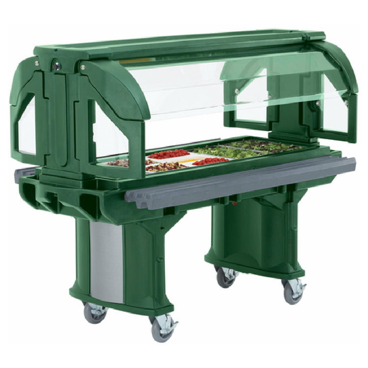 The Cambro VBRHD5519 Versa Food Bar™ Serving Buffet Cold Food 5 Ft. Unit is a versatile and robust solution for food service operations that require a reliable cold food presentation. Measuring 69 inches in length, 42-1/2 inches in width, and 62-3/4 inches in height, this unit is designed to hold four full-size pans, accommodating various food pan sizes up to 6 inches deep. The unit is cooled using optional Camchillers® or ColdFest® technology, ensuring optimal temperature control without the need for electrical components. Constructed from durable double-wall polyethylene, the Cambro VBRHD5519 includes molded-in handles for easy maneuverability. The unit is equipped with a threaded faucet drain for efficient liquid management, and features heavy-duty 6-inch swivel casters with brakes, providing stability and ease of transport. Available in a distinctive Kentucky green color, this made-to-order unit is NSF certified, underscoring its compliance with rigorous public health standards. Ideal for catering events, buffet settings, or institutional dining, the Cambro VBRHD5519 offers a blend of functionality and aesthetic appeal, catering to diverse market segments within the food service industry.