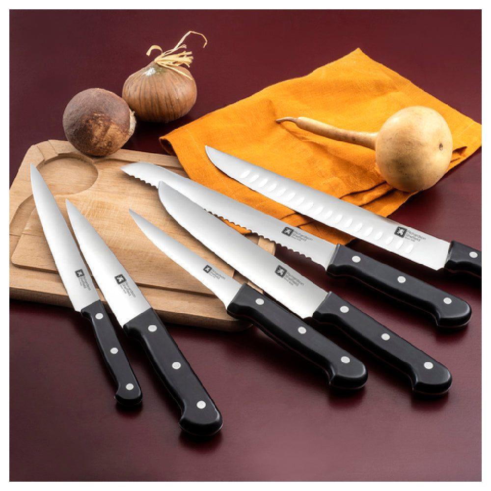 The Arc Cardinal FN207 Butcher Knife 10" With Notches is a meticulously crafted tool designed for precision and efficiency in professional kitchens. This high-quality butcher knife features a 10-inch MoV steel blade, renowned for its durability and superior edge retention, making it ideal for demanding meat processing tasks. The blade includes notches, enhancing the knife's cutting performance by reducing friction and allowing for smoother, cleaner cuts. Its full tang construction ensures balanced weight distribution and added strength, crucial for heavy-duty use. The knife is equipped with a black ABS handle that provides a comfortable and secure grip, complemented by three stainless steel rivets that enhance the handle's stability and longevity. As a product of Richardson Sheffield, a respected name in cutlery manufacturing, this knife promises reliability and exceptional craftsmanship. Packaged as a stock item and shipped from Totowa, NJ 07512, the Arc Cardinal FN207 is available in cases of six, catering effectively to the needs of large-scale commercial environments. Its universal application across various segments of the food industry makes it a versatile and indispensable tool for chefs and butchers alike, underscoring its role as a cornerstone in any professional cutlery collection.