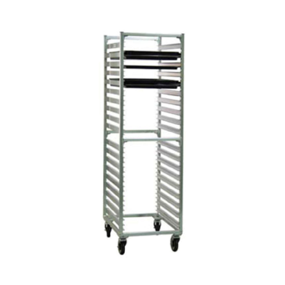 The Carter Hoffmann O1838C Pan Rack is a meticulously designed unit measuring 20-3/8"W x 26"D x 69-3/4"H, ideal for various food service environments. This pan rack features open sides and fixed angle slides, accommodating up to 38 trays with dimensions of 18" x 26". With a spacing of 1-1/2" between each tray, it provides ample room for efficient storage and organization. Constructed from durable aluminum, this rack is both lightweight and robust, ensuring longevity and ease of handling. Its lip-loaded, end-loading design allows for straightforward access and management of trays. The all-welded construction enhances its structural integrity, making it a reliable choice for high-volume operations. Equipped with 5" swivel casters, this pan rack offers smooth mobility, facilitating easy transport within any professional kitchen setting. The Carter Hoffmann O1838C Pan Rack stands out as a versatile and practical solution for bakeries, restaurants, and catering services, ensuring efficient workflow and space management.