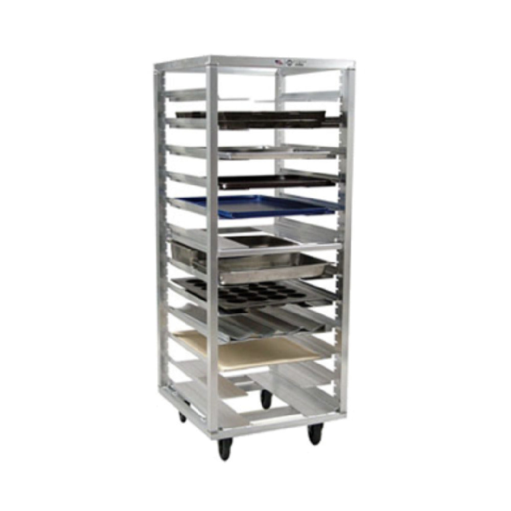 The Carter Hoffmann O8631V Pan Rack stands at an impressive 64-1/4 inches in height and 24-1/4 inches in width, providing ample storage solutions for commercial kitchens and foodservice operations. This universal pan rack boasts a depth of 26-1/2 inches and is capable of accommodating either twelve 18 x 26-inch trays or twenty-four 12 x 20-inch pans, with a spacing of 4-1/2 inches. Its adjustable slides, which can be modified in 1-1/2 inch increments, offer flexibility to suit varying storage needs. Constructed from durable aluminum, the rack is designed for end loading, ensuring easy access and organization. Its robust structure is complemented by 5-inch casters, enhancing mobility and ease of movement within busy kitchen environments. The Carter Hoffmann O8631V Pan Rack is an essential asset for foodservice professionals, combining practicality with sturdy construction to meet the demanding requirements of high-volume operations, such as restaurants, bakeries, and catering services. Its versatility and capacity make it a valuable addition to any establishment that requires efficient, organized pan storage.