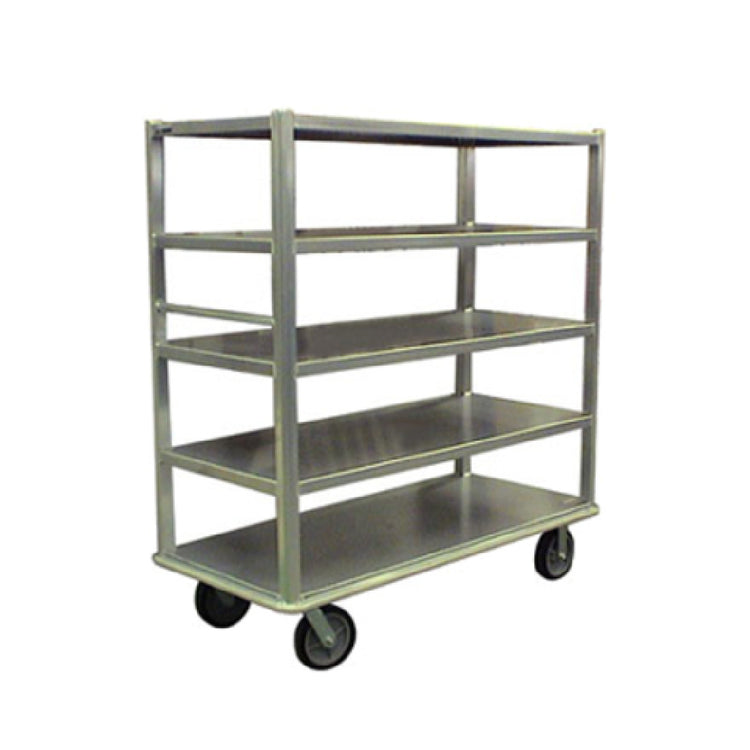 Carter Hoffmann T546 Queen Mary China & Silver Transporter Open Design stands as an efficient solution for transporting delicate items like china and silver within hospitality and catering environments. The transporter features an open design with a robust aluminum tubular frame, ensuring durability and stability during transit. It is equipped with six spacious shelves, each measuring 27" x 54", providing ample space for organized storage and transportation. The shelf clearance of 8" allows for easy loading and unloading of items, catering to diverse needs. Mobility is enhanced with 8" casters, featuring two swivel and two rigid casters, ensuring smooth and controlled movement across various surfaces. A convenient push handle adds to the ease of maneuverability, making this transporter user-friendly. This product is constructed from aluminum, which not only contributes to its lightweight nature but also ensures resilience against wear and tear, making it ideal for frequent use in high-demand settings. The Carter Hoffmann T546 is a versatile transporter that effectively meets the demands of different market segments, such as hotels, restaurants, and event venues, by offering an efficient and reliable transportation solution for valuable service items.