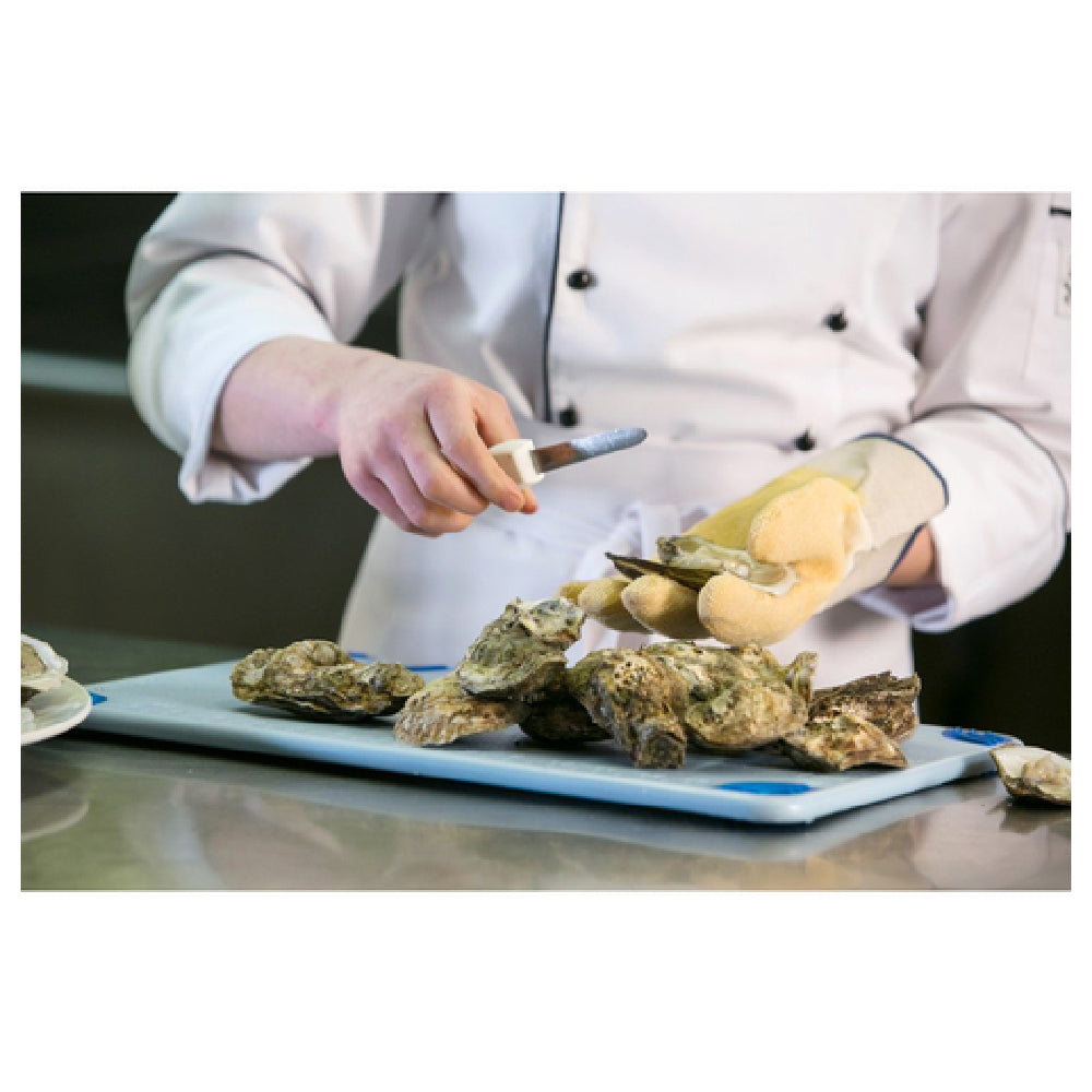 The Carlisle 1000 San Jamar Oyster Shucking Glove stands out as a versatile and robust accessory, essential for the seafood industry. This glove is engineered with a one-size-fits-all design, accommodating various hand sizes to ensure a comfortable fit for all users. Its wet or dry grip capability allows for effective handling of oysters in diverse environments, whether you are working in a damp seafood market or a dry kitchen setting. The glove's construction is both cut and abrasion-resistant, providing enhanced protection against the sharp edges and rough surfaces encountered during oyster shucking. Made from natural rubber, the glove offers a unique combination of flexibility and durability, ensuring that users can maintain dexterity and control while working. The Carlisle 1000 San Jamar Oyster Shucking Glove is an invaluable tool for professionals across segments, from restaurant chefs seeking safe and efficient shucking solutions to seafood distributors and home cooks looking for reliable hand protection. By integrating advanced material technology with user-centric design, this glove enhances safety and efficiency in oyster shucking tasks.