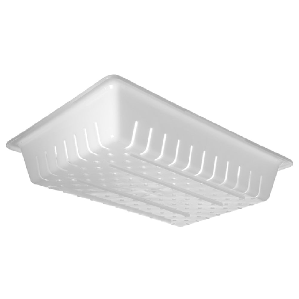The Carlisle 1064802 Carlisle StorPlus™ Colander, measuring 26"L x 18"W x 5"H, is a versatile rectangular kitchen tool designed to meet the rigorous demands of commercial food service environments. This colander is crafted from durable polyethylene, ensuring a robust, long-lasting performance that withstands frequent use. Its perforated and slotted design allows for efficient drainage, making it an essential asset for food preparation processes that require rinsing and draining. Notably, it is stackable, which optimizes storage space when used in conjunction with boxes measuring 26" x 18" x 6" or deeper, adding functional value to busy kitchens. The colander is dishwasher safe, simplifying the cleaning process and maintaining hygiene standards effortlessly. Certified by NSF, it aligns with strict public health and safety regulations, offering peace of mind to professional kitchens prioritizing compliance. Proudly made in the USA, the Carlisle StorPlus™ Colander exemplifies quality and reliability. Its white color provides a clean, professional look that complements various kitchen aesthetics. This product is ideally suited for restaurants, catering services, and other food service industries, providing a reliable solution for food handling and preparation needs.