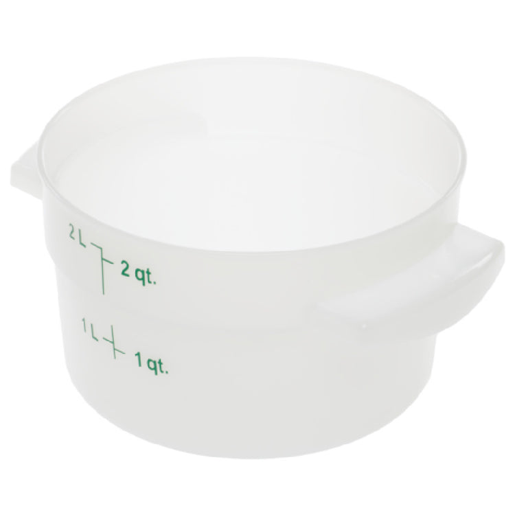 The Carlisle 1097302 Carlisle StorPlus™ Food Storage Container 2 Qt. Round is a versatile and durable solution for various food storage needs. With a capacity of 2 quarts, this round storage container is ideal for both residential and commercial kitchen environments. Featuring molded-in capacity indicators, it offers precise measurements for accurate portion control and inventory management. The inclusion of handles ensures easy transportation and handling, enhancing its practicality in busy settings. Constructed from robust polycarbonate material, this container is both resilient and lightweight, providing longevity and ease of use. The white color complements a range of kitchen aesthetics while maintaining a clean and professional appearance. As an NSF certified product, it meets stringent public health and safety standards, making it a reliable choice for food service establishments. Proudly made in the USA, the Carlisle StorPlus™ Food Storage Container is designed to support the rigorous demands of the foodservice industry while offering a practical storage solution for various ingredients and prepped items. Its thoughtful design and durable construction make it a valuable asset for chefs, caterers, and home cooks alike, ensuring that food is stored safely and efficiently.