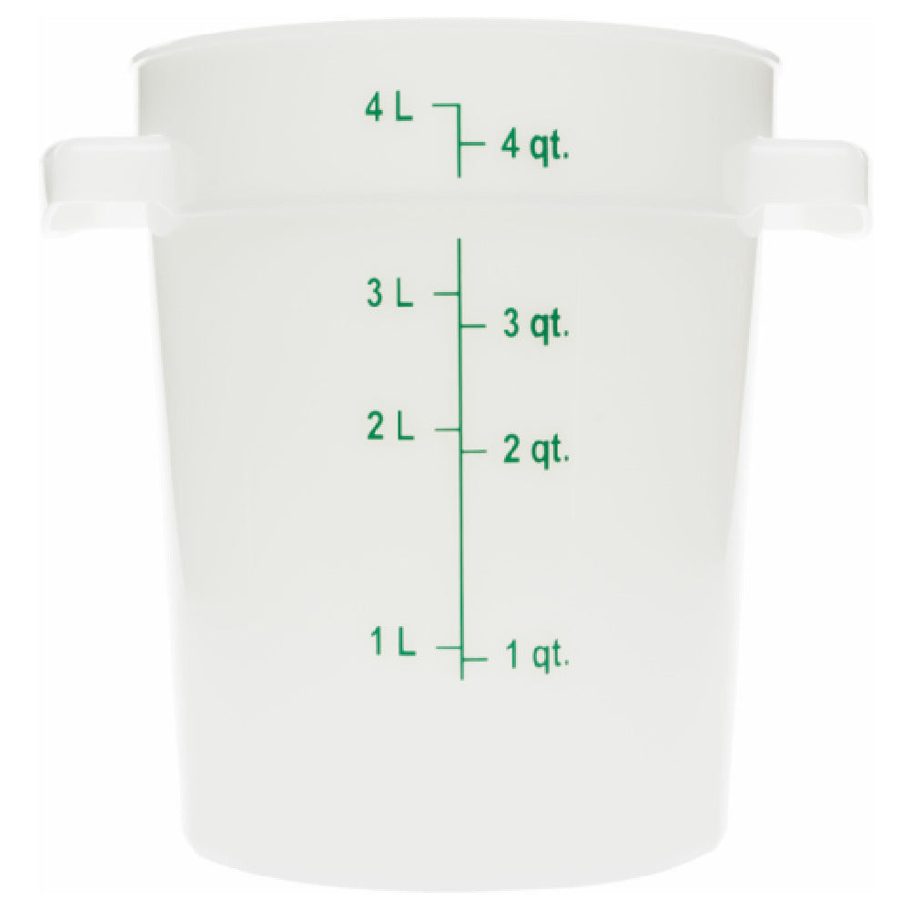 The Carlisle 1097402 Carlisle StorPlus™ Food Storage Container 4 Qt. Round is a meticulously designed storage solution, featuring a durable polycarbonate construction that ensures long-lasting use in various foodservice environments. This 4-quart capacity container is equipped with molded-in capacity indicators, allowing for precise volume measurement and efficient inventory management. Its round shape and integrated handles enhance ease of handling, making it an excellent choice for busy kitchens that require quick and efficient food storage. The container's white color adds a clean and professional look, seamlessly fitting into any kitchen setup. Certified by the NSF, it meets stringent public health standards, emphasizing its safety and reliability in food storage applications. Proudly made in the USA, this container exemplifies quality manufacturing standards. The Carlisle StorPlus™ Food Storage Container is particularly suited for restaurants, catering services, and institutional kitchens, providing a robust and hygienic solution for storing ingredients and prepared foods. Its polycarbonate material offers superior resistance to breakage compared to traditional plastics, while also being easy to clean, thus maintaining high hygiene standards. With its thoughtful design and practical features, this storage container serves as an essential tool for foodservice professionals seeking dependable and effective storage solutions.