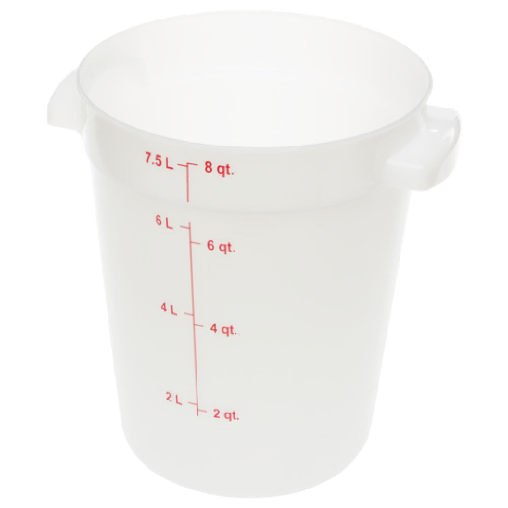 The Carlisle 1097602 Carlisle StorPlus™ Food Storage Container 8 Qt. Round is a quintessential choice for various food storage needs across the culinary industry. This storage solution boasts an 8-quart capacity, providing ample space for a variety of ingredients, making it suitable for both commercial kitchens and home use. Crafted from durable polycarbonate, the container ensures longevity and resistance to impact, maintaining its integrity under rigorous conditions. Its round design is complemented by molded-in capacity indicators, allowing for precise measurement and efficient inventory management. The inclusion of handles enhances ease of handling and maneuverability, facilitating transport and storage operations. Available in a clean white finish, this container seamlessly integrates with diverse kitchen aesthetics. Its NSF certification underscores its compliance with stringent public health and safety standards, ensuring it meets the demands of professional catering and foodservice environments. Proudly made in the USA, the Carlisle StorPlus™ Food Storage Container exemplifies quality craftsmanship and reliable performance. This versatile container is an indispensable asset for foodservice operators aiming to optimize storage solutions with a focus on durability and functionality.