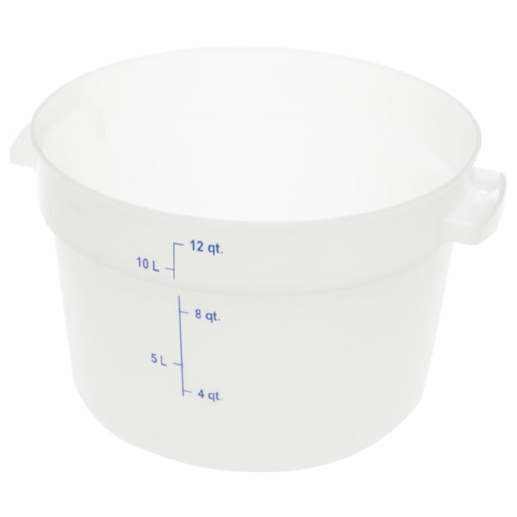 The Carlisle 1097702 Carlisle StorPlus™ Food Storage Container 12 Qt. Round is a versatile and robust solution for diverse food storage needs, crafted with precision to meet industry standards. This 12-quart round container features molded-in capacity indicators that provide clear volume measurements, ensuring precise food storage management. Designed with practicality in mind, the container is equipped with convenient handles, facilitating easy transportation and handling in various kitchen environments. Constructed from durable polycarbonate material, it offers exceptional strength and resistance to impact, making it a reliable choice for busy food service settings. The distinctive white color of the container not only adds a sleek aesthetic but also enhances visibility for quick identification of contents. Proudly made in the USA, this container adheres to NSF standards, underscoring its commitment to safety and quality in food handling. Ideal for commercial kitchens, catering services, and food production facilities, the Carlisle StorPlus™ Food Storage Container provides an efficient storage solution that meets the rigorous demands of the food industry while ensuring durability and ease of use.
