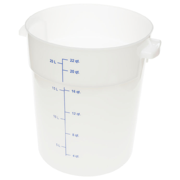 The Carlisle 1097902 Carlisle StorPlus™ Food Storage Container 22 Qt. Round is an exemplary solution for food service professionals seeking high-quality storage solutions. This product features a substantial 22-quart capacity, making it ideal for both small and large-scale operations. The round design incorporates molded-in capacity indicators, facilitating precise measurement and portioning. Constructed from durable polycarbonate, this container is designed to withstand the rigors of frequent use while maintaining its structural integrity. The inclusion of handles enhances its portability and usability, allowing for easy transportation and handling in busy kitchen environments. Its pristine white color not only offers a clean appearance but also aids in quick identification amongst other storage solutions. This container holds the NSF certification, underscoring its adherence to public health standards and ensuring safe food storage. Proudly made in the USA, the Carlisle 1097902 is a testament to quality craftsmanship and reliability. Its robust design and functional features make it well-suited for various segments within the food service industry, including catering businesses, restaurants, and institutional kitchens, providing an efficient and dependable storage option that meets diverse culinary needs.