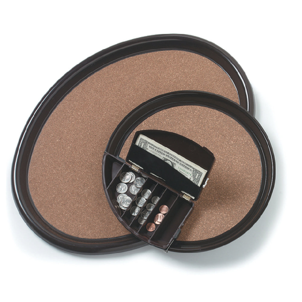 The Carlisle 140101 Carlisle Money Maid™ Clip-On is a versatile and practical accessory designed to enhance the efficiency of service professionals. This compact unit measures 9"L x 5"W x 2-1/4"H and features a locking coin and bill compartment, ensuring the safe and organized storage of cash during service operations. Its polystyrene construction offers durability while being BPA free, promoting a safe and eco-friendly choice for users. The brown finish adds a touch of professionalism and blends seamlessly with various service environments. Equipped with a napkin holder and utility pocket, this clip-on unit supports service staff by providing easy access to essential tools and supplies. The Money Maid™ Clip-On is engineered to fit all standard 14" diameter round trays, making it an adaptable tool for restaurants, cafes, and catering services. Its thoughtful design focuses on functionality and security, making it a valuable asset for front-of-house operations. By consolidating multiple service elements into one compact unit, the Carlisle 140101 enhances efficiency and convenience for service professionals, catering to both small and large service environments with its robust and reliable features.
