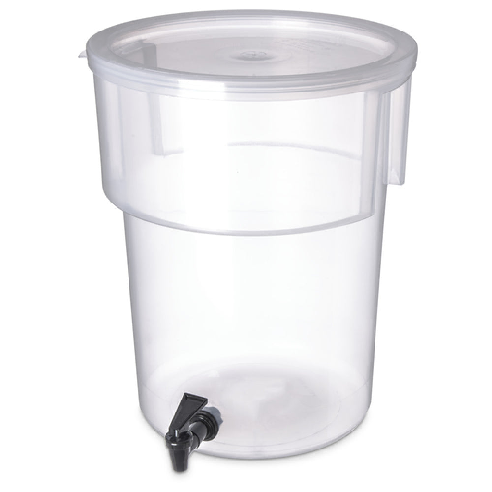 The Carlisle 220930 Carlisle Beverage Dispenser, with a 5-gallon capacity, is expertly designed for both commercial and residential use, providing a reliable solution for beverage dispensing needs. Measuring 15-3/7 inches in height and 12-3/8 inches in diameter, this round dispenser is crafted from clear polypropylene, ensuring durability and easy monitoring of beverage levels. It features capacity side indicators, allowing for quick and accurate beverage volume assessments. The spring action no-drip faucet is engineered to provide a mess-free pouring experience, enhancing user convenience. Additionally, this dispenser is dishwasher safe, facilitating effortless cleaning and maintenance. It comes with a set of labels - fruit punch, iced tea, lemonade, sweetened & unsweetened tea, enabling easy identification of contents. Notably, this product is recyclable, aligning with sustainable practices, and it is proudly made in the USA, reflecting quality and reliability. The Carlisle 220930 dispenser is an exemplary choice across various sectors such as catering, hospitality, and event planning, offering a blend of practicality and eco-friendly design to cater to diverse market needs.