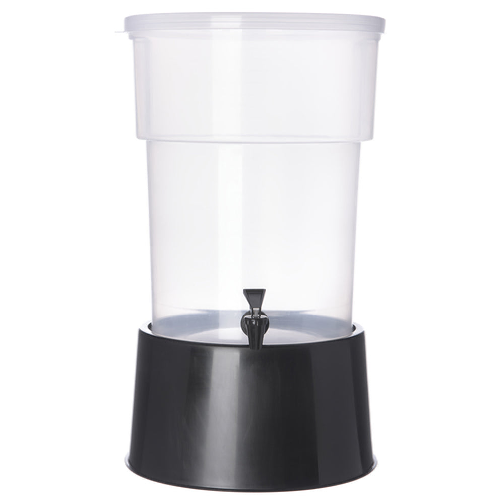 The Carlisle 222903 Carlisle Beverage Server 5 Gallon 21-1/2"H X 12-3/8" Dia. is a meticulously designed unit that caters to the beverage service industry with remarkable efficiency and practicality. This round beverage server features a single bowl/base with a substantial 5-gallon capacity, ideal for serving a variety of drinks at large gatherings or in busy establishments. The server includes capacity side indicators, allowing users to easily monitor the liquid levels, ensuring seamless service without interruptions. One of its standout features is the spring action no-drip faucet, which minimizes spillage and waste, enhancing user convenience. This beverage server is made of translucent polypropylene, offering a lightweight yet durable construction, while its black color adds a sleek aesthetic to any setting. Labels for fruit punch, iced tea, lemonade, and both sweetened and unsweetened tea are included, providing versatility in beverage options. Designed with practicality in mind, it is dishwasher safe, making cleaning a hassle-free task. Furthermore, the product is recyclable, supporting eco-friendly practices. Proudly made in the USA, the Carlisle 222903 Beverage Server is a reliable choice for any professional catering service, restaurant, or event needing efficient and sustainable beverage serving solutions.