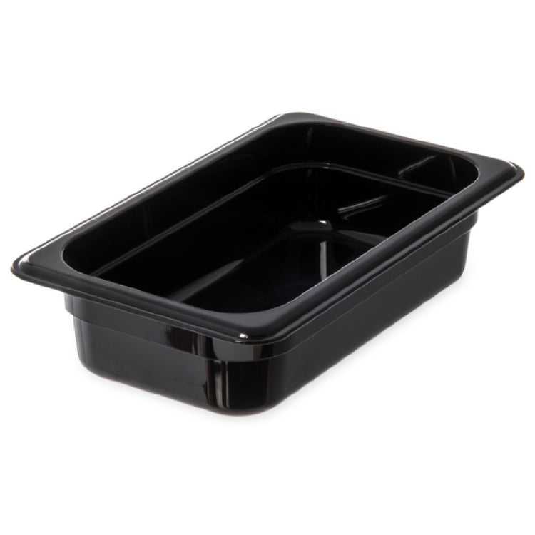 The Carlisle 3068003 Carlisle StorPlus™ Food Pan 1/4 Size 1.37 Oz. Capacity is an expertly crafted product suitable for various food service environments, including restaurants and catering operations. With dimensions of 12-3/4" x 6-7/8" x 2-1/2" deep, this food pan offers ample space within a compact form, allowing for versatile use in diverse kitchen settings. Engineered to withstand temperatures ranging from -40°F to 212°F, it is ideal for both cold and hot food storage. Its reinforced top and bottom corners provide increased durability, making it a reliable choice for high-volume kitchens. The spoonable bottom enhances ease of use when serving, ensuring minimal food waste. Made from robust polycarbonate, this pan features a smooth interior finish for easy cleaning and a textured non-slip exterior finish for secure handling. Available in a sleek black color, it complements various kitchen aesthetics while maintaining NSF certification, which signifies compliance with health and safety standards in food service. Additionally, it is dishwasher safe, further simplifying maintenance processes. This versatile food pan is a valuable asset to any professional kitchen, offering a balance of practicality and durability.