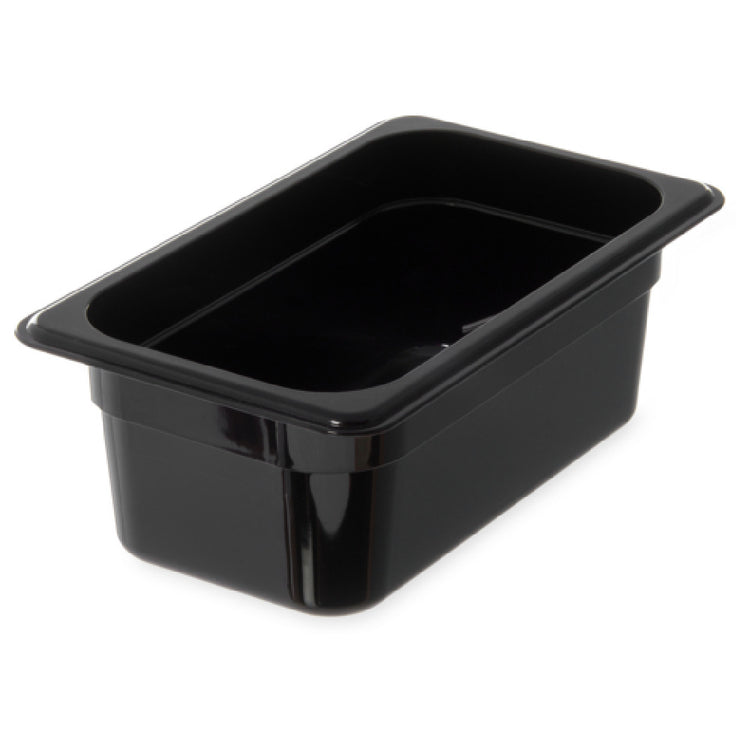 The Carlisle 3068103 Carlisle StorPlus™ Food Pan 1/4 Size 2 Qt. Capacity is a versatile and robust solution for food storage needs, ideally suited for various segments within the food service industry, including restaurants, catering services, and institutional kitchens. This food pan is designed with a 1/4 size dimension, measuring 12-3/4 inches in length, 6-7/8 inches in width, and 4 inches in depth, offering a 2-quart capacity. It boasts a broad temperature range of -40 to 212 degrees Fahrenheit, ensuring durability and reliability in both cold and hot environments. The reinforced top and bottom corners provide added strength, making it a long-lasting choice for rigorous kitchen settings. Its spoonable bottom design allows for efficient food removal, reducing waste and enhancing operational efficiency. The pan's smooth interior finish ensures easy cleaning, while the textured non-slip exterior finish provides a secure grip during handling. Constructed from polycarbonate in a sleek black color, this food pan is not only visually appealing but also NSF certified, guaranteeing adherence to public health standards. Its dishwasher-safe attribute further emphasizes convenience in maintenance, making the Carlisle StorPlus™ Food Pan a practical and dependable addition to any professional kitchen.