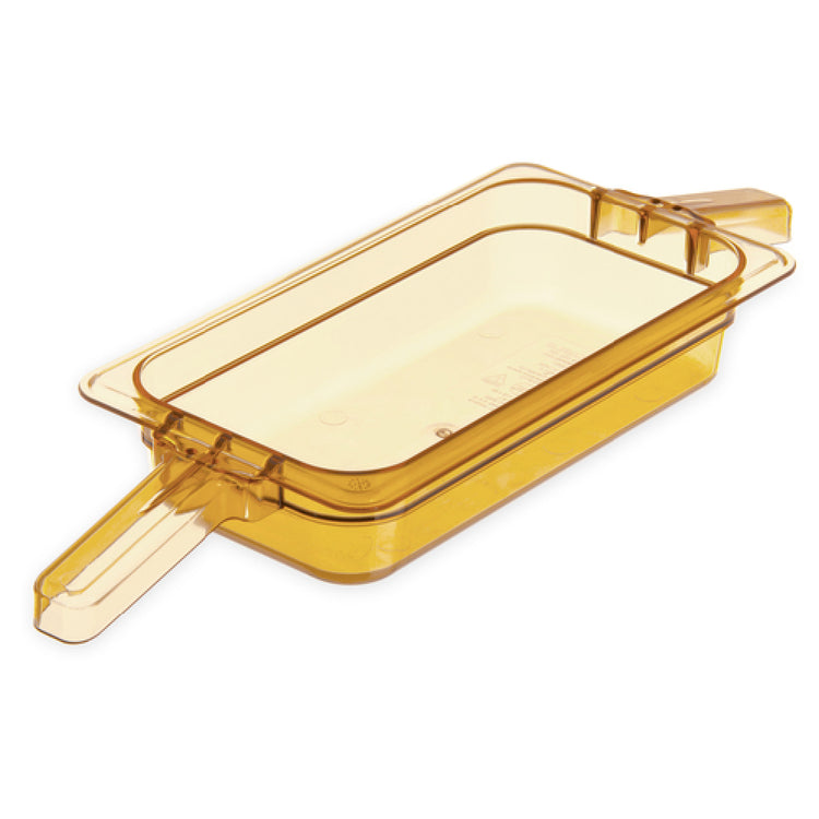 The Carlisle 30860HH13 Carlisle StorPlus™ High Heat Hot Food Pan 1/3 Size 2.4 Qt. Capacity is a versatile and durable kitchen essential designed to withstand a broad temperature range from -40°F to 380°F, making it ideal for a variety of culinary applications. With a 2.4-quart capacity and 2-1/2" depth, this pan is well-suited for both commercial and household use, offering ample space for serving and storing hot foods. Constructed from robust polyether sulfone, the pan is break and stain-resistant, ensuring longevity and maintaining its appearance over time. Its amber color adds a distinct touch to any kitchen setup. The pan is microwave and dishwasher safe, enhancing convenience and efficiency in food preparation and cleanup. Its design includes double handles and an easy-lift notch for effortless handling, while capacity indicators assist in accurate portioning. The pan is stackable, optimizing storage space in busy kitchen environments. It is BPA free and NSF certified, ensuring it meets high health and safety standards, and is made in the USA, reflecting its quality craftsmanship. Additionally, it meets EN631-1 Euro Norm standards, guaranteeing its suitability for international markets and professional settings.