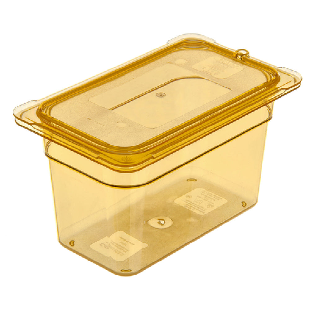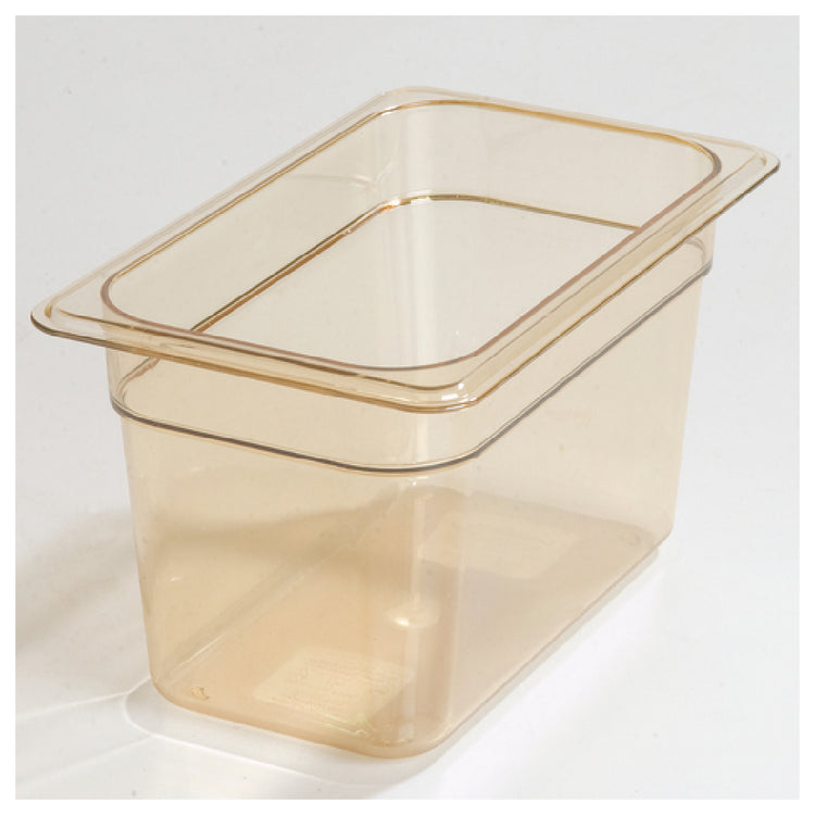 The Carlisle 3088213 Carlisle StorPlus™ High Heat Hot Food Pan 1/4 Size 4 Qt. Capacity is expertly designed to meet the demanding needs of the food service industry. This versatile food pan boasts a 4-quart capacity and is 6 inches deep, making it suitable for various culinary applications. Constructed from polyether sulfone, it is both break and stain-resistant, ensuring durability in high-pressure kitchen environments. Capable of withstanding temperatures up to 380°F, this hot food pan is ideal for high-heat applications, providing reliability and performance. Its easy-lift notch design facilitates effortless handling, enhancing efficiency in busy kitchens. The pan is stackable, promoting space-saving storage solutions. For added convenience, it is dishwasher and microwave safe, streamlining kitchen operations. Additionally, the pan features capacity indicators for precise portion control, a valuable asset for food service professionals. The amber color of the pan adds a touch of distinction, while its BPA-free composition ensures safety in food preparation. Certified by NSF, this pan meets stringent public health standards, further solidifying its status as a trusted choice in professional kitchens. Proudly made in the USA, the Carlisle 3088213 exemplifies quality and reliability, catering to the diverse needs of the food service industry.