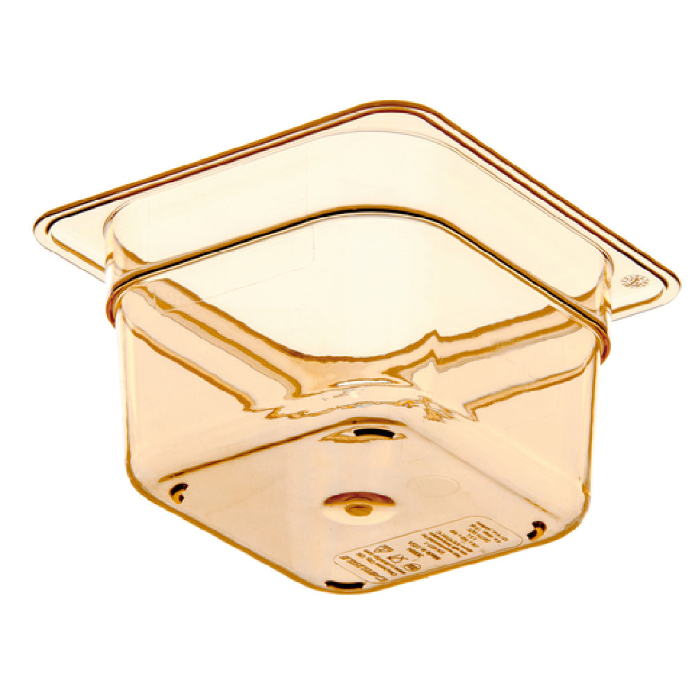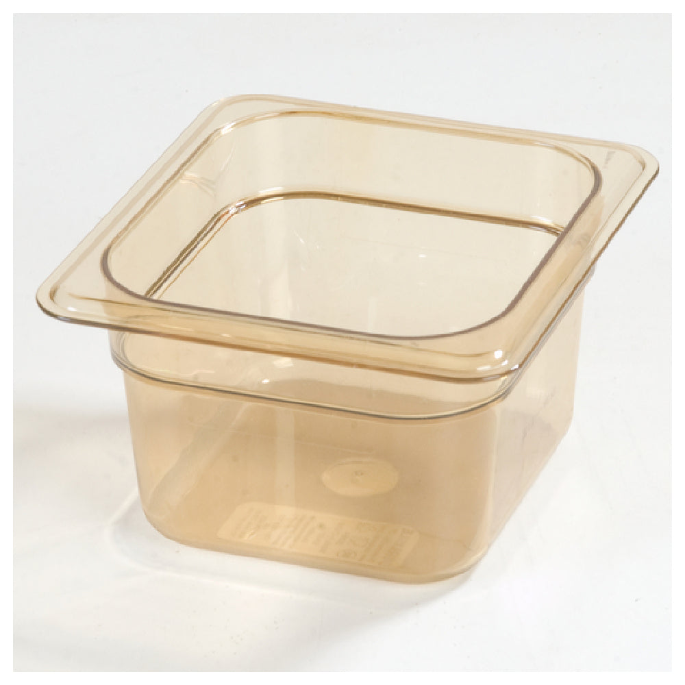 The Carlisle 3088413 Carlisle StorPlus™ High Heat Hot Food Pan 1/6 Size 1.7 Qt. Capacity is a versatile kitchen essential designed for professional and home chefs requiring durable, high-performance food storage solutions. This pan boasts a 1/6 size and a 1.7-quart capacity with a 4-inch depth, making it ideal for various culinary applications. Crafted from polyether sulfone, it is heat-resistant up to 380°F, ensuring reliability even in demanding kitchen environments. Its stackable design enhances storage efficiency, while the easy-lift notch facilitates convenient handling. The pan's break and stain-resistant properties, along with built-in capacity indicators, provide both durability and precision in food preparation. This product is dishwasher and microwave safe, offering convenience for fast-paced kitchen operations. With its amber color, the Carlisle 3088413 not only meets but exceeds industry standards, being both BPA free and NSF certified, ensuring it adheres to rigorous safety and quality benchmarks. Proudly made in the USA, this high-heat food pan is an excellent choice for food service professionals seeking a reliable and robust solution for managing hot food items efficiently and effectively.