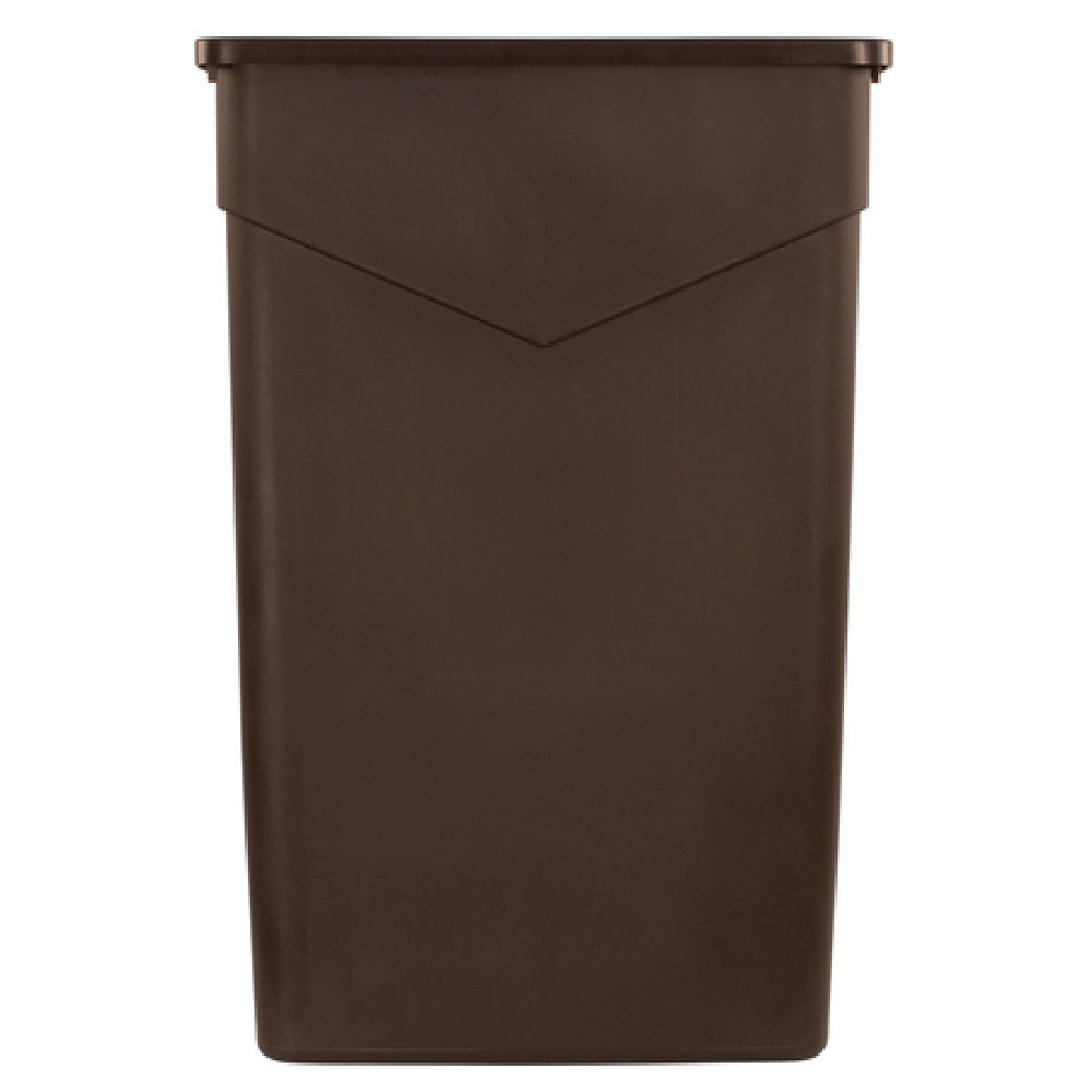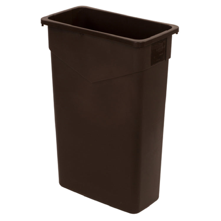 The Carlisle 34202369 Carlisle Trimline™ Waste Container 23 Gallon Rectangular is a high-capacity waste management solution, specifically designed to meet the rigorous demands of various professional settings. With a substantial 23-gallon capacity, this rectangular waste container is ideally suited for environments requiring efficient waste disposal without frequent emptying. Constructed from heavy-duty polyethylene, its robust build ensures durability and longevity, accommodating the needs of restaurants, hotels, and other high-traffic areas. The integrated corner tabs are a thoughtful design feature, enhancing the structural integrity and ease of handling during transportation and cleaning processes. Further facilitating usability, the bottom helper handles provide a secure grip for maneuvering and emptying the container, reducing strain and enhancing safety for users. The brown color of the unit not only blends seamlessly with diverse interior aesthetics but also aids in waste segregation practices. The Carlisle 34202369 stands out in its category with a focus on practicality and resilience, making it a valuable asset for waste management in various industries. Its streamlined design and functional features are engineered to support efficient waste operations while maintaining a professional appearance. This product exemplifies Carlisle's commitment to quality and innovation in waste management solutions.