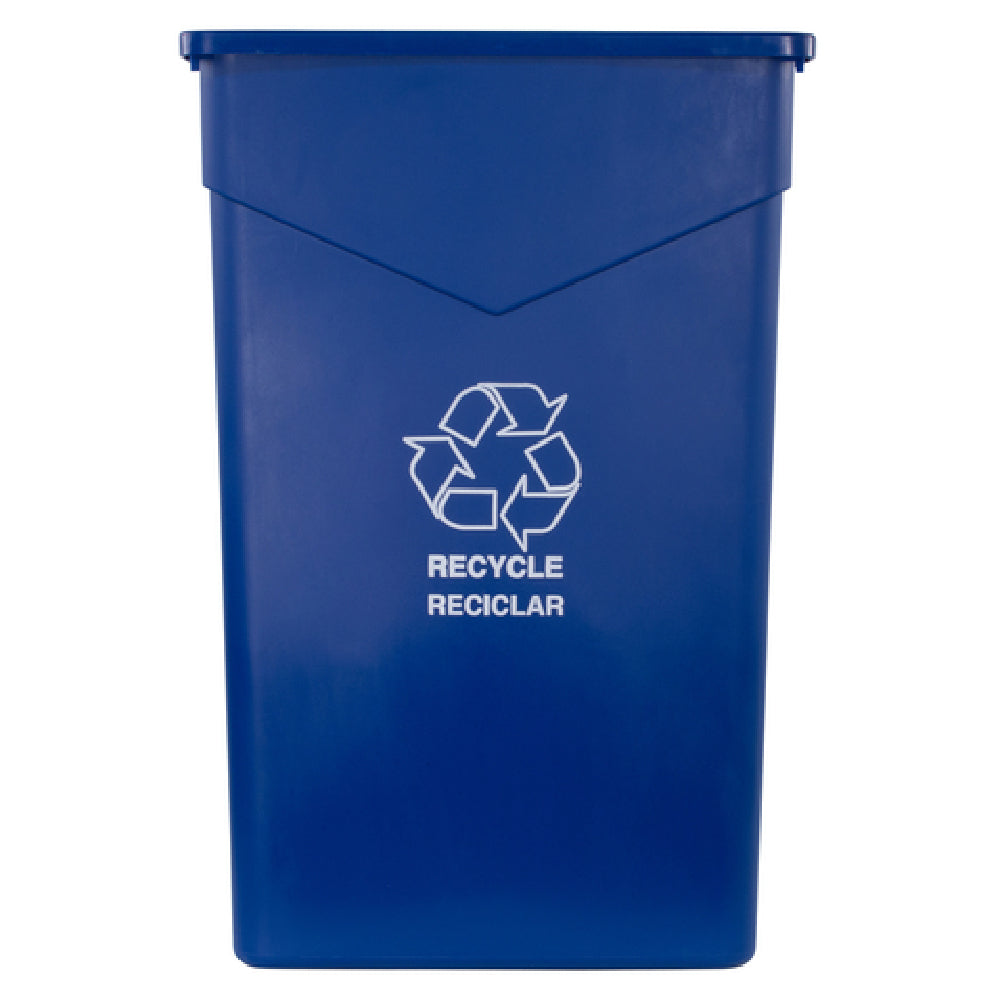 The Carlisle 342023REC14 Carlisle Trimline™ Recycle/Waste Container 23 Gallon is a versatile and practical solution for waste management needs in various settings. This rectangular container is designed to handle a capacity of 23 gallons, making it suitable for medium to large-scale waste disposal tasks. It is constructed from heavy-duty polyethylene in a striking blue color, ensuring durability and resistance to wear and tear over time. The container is imprinted with a recycling symbol, clearly designating its use for recycling purposes, which can help streamline waste sorting processes in commercial, industrial, or institutional environments. The integrated corner tabs provide additional stability and ease of use, while the bottom helper handles facilitate straightforward lifting and maneuvering, even when the container is full. These features make it a practical choice for janitorial and waste management professionals who require reliable and efficient equipment. The Carlisle 342023REC14 is an exemplary product within its category, offering a combination of durability, usability, and capacity that meets the demands of diverse market segments, ranging from office buildings and schools to restaurants and healthcare facilities, where organized waste management is essential.