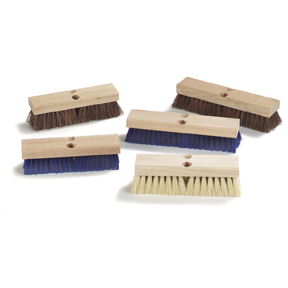 The Carlisle 3617514 Carlisle Flo-Pac® Deck Scrub Brush Head (only) 10"L x 2-3/4"W is an essential tool for maintaining clean and sanitary surfaces in various industrial and commercial settings. This particular model features a robust hardwood block construction, measuring 10 inches in length and 2-3/4 inches in width, making it suitable for covering sizable areas efficiently. It is equipped with chemically resistant, crimped, stiff polypropylene bristles that ensure durability and effective cleaning power against tough grime and dirt. The threaded handle hole allows for easy attachment to compatible handles, enhancing user convenience and control during use. The blue coloration of the bristles not only adds a professional appearance but also aids in maintaining color-coded cleaning protocols, promoting hygiene and organization. This deck scrub brush head is well-suited for different market segments within the cleaning industry, including janitorial services and facility maintenance teams, who require reliable and heavy-duty cleaning equipment. The combination of its sturdy material construction and functional design features positions the Carlisle 3617514 as a dependable choice for those seeking performance and longevity in a deck scrub brush head.